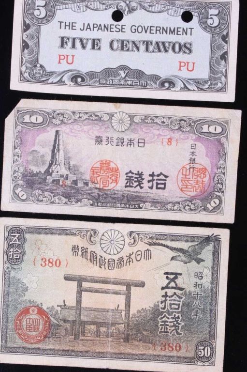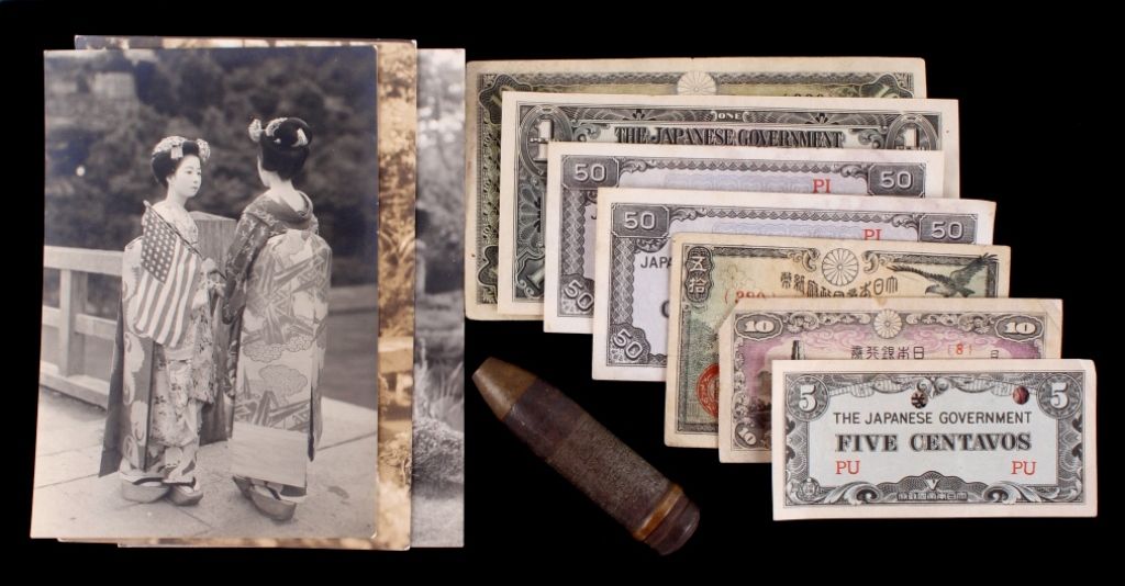 This includes 7 pieces of Japanese currency, mortor fuse, and three Japanese photographs. The currency is mainly all Japanese Government 1940's pieces. These are all collectible pieces. The photographs show Japan women holding an American flag.