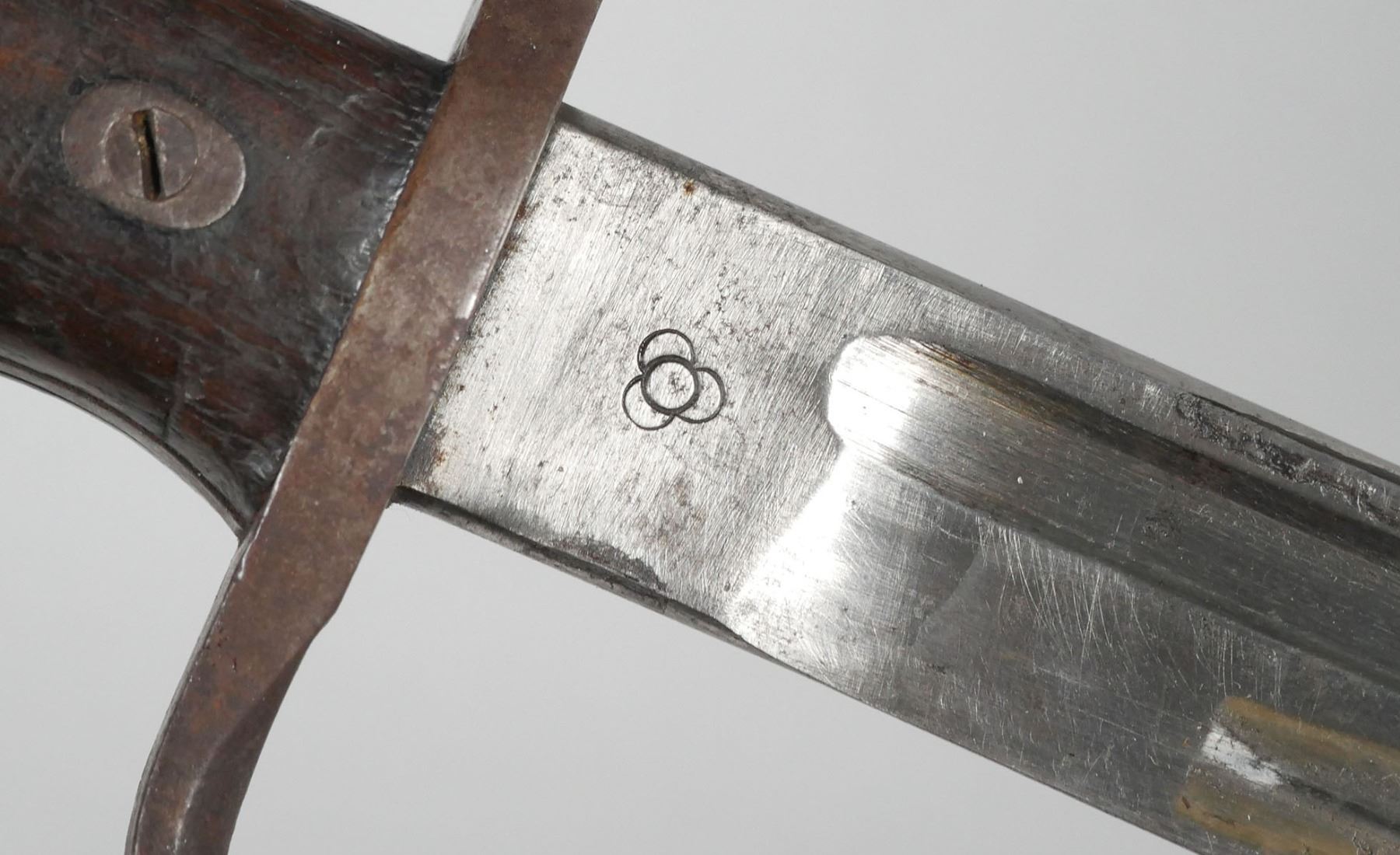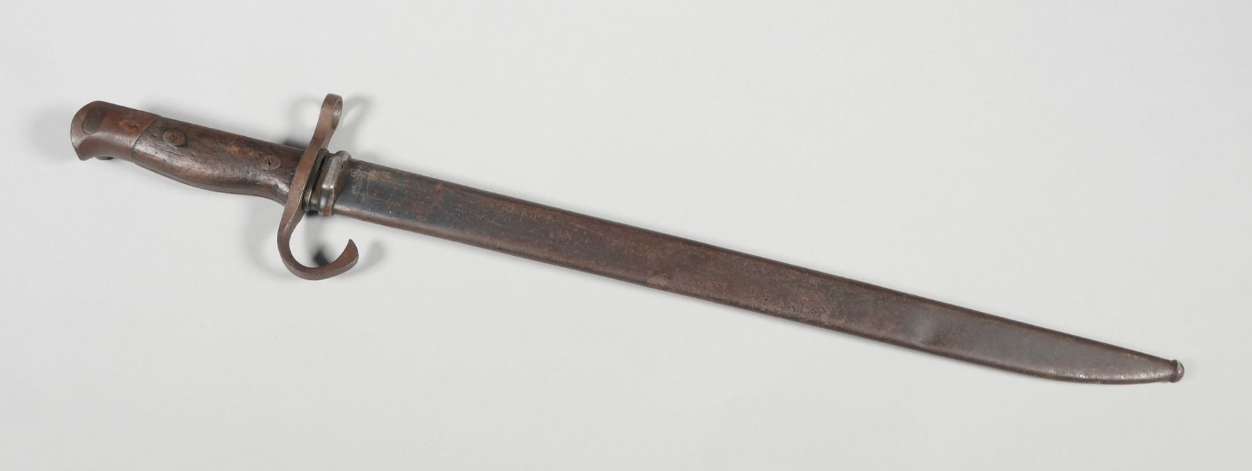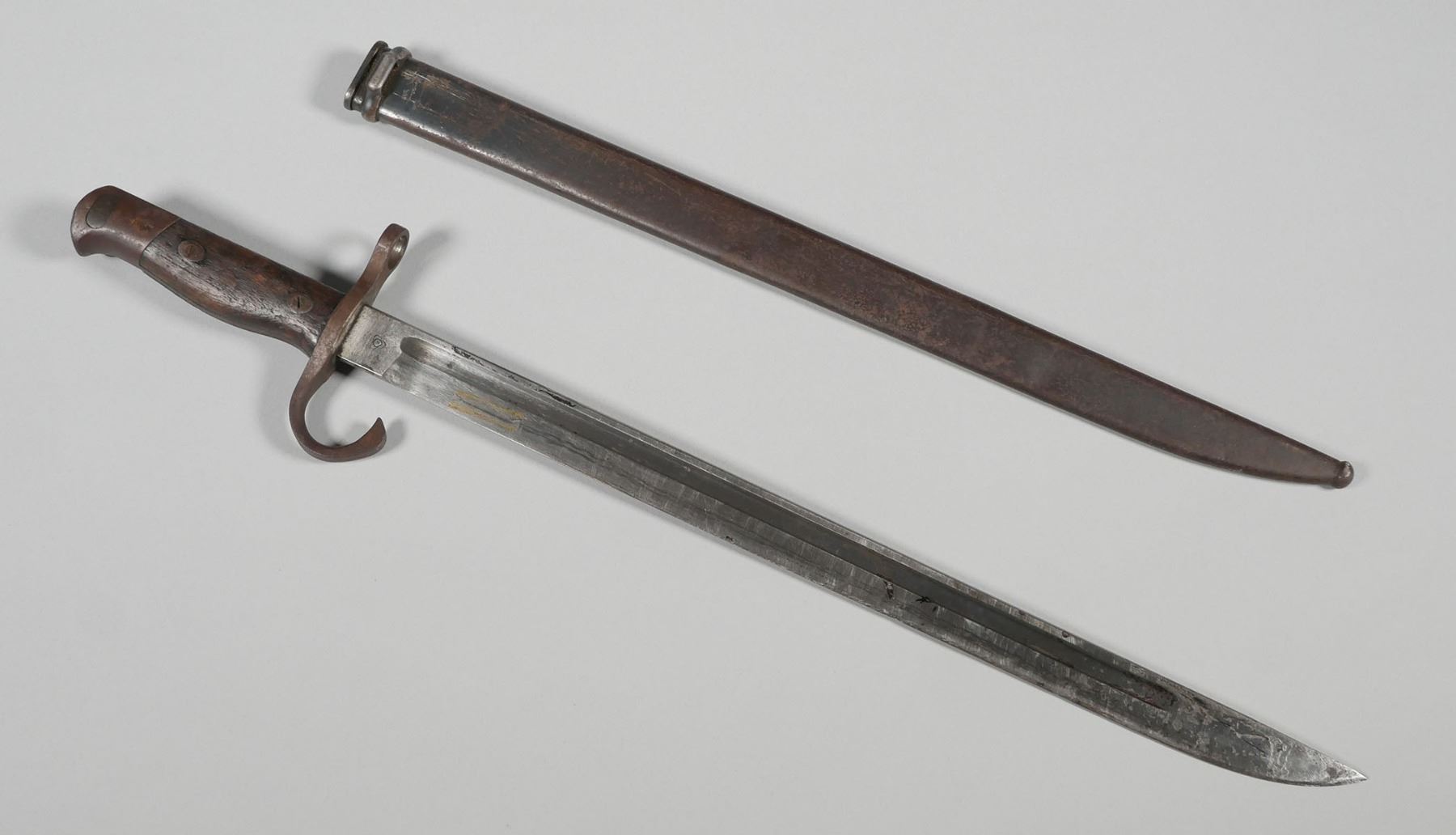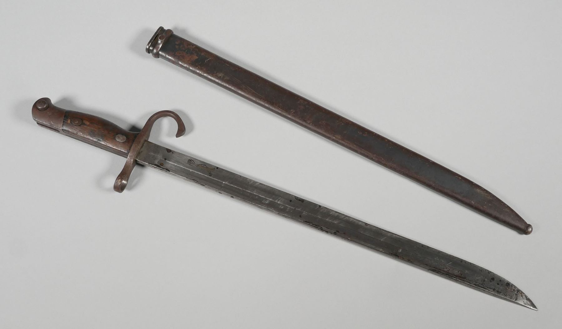 Japanese Arisaka bayonet serial #3074447. 15 5/8" blade, 20" overall. Bayonet & scabbard have age appropriate wear & oxidation. Scabbard has some dents. See photos for more details on condition.