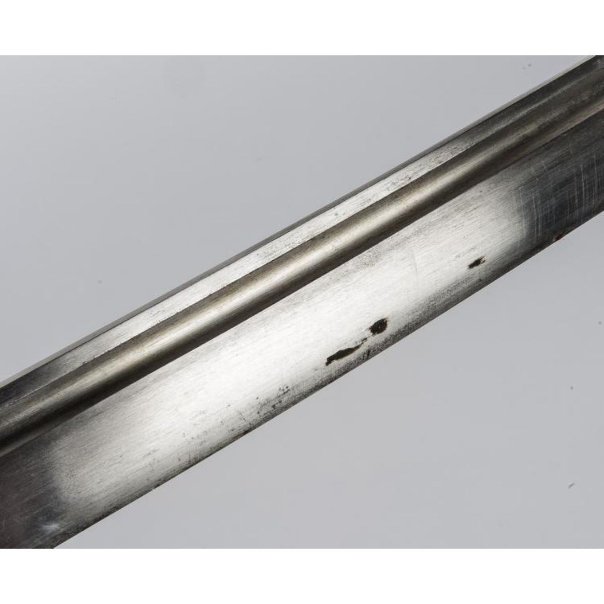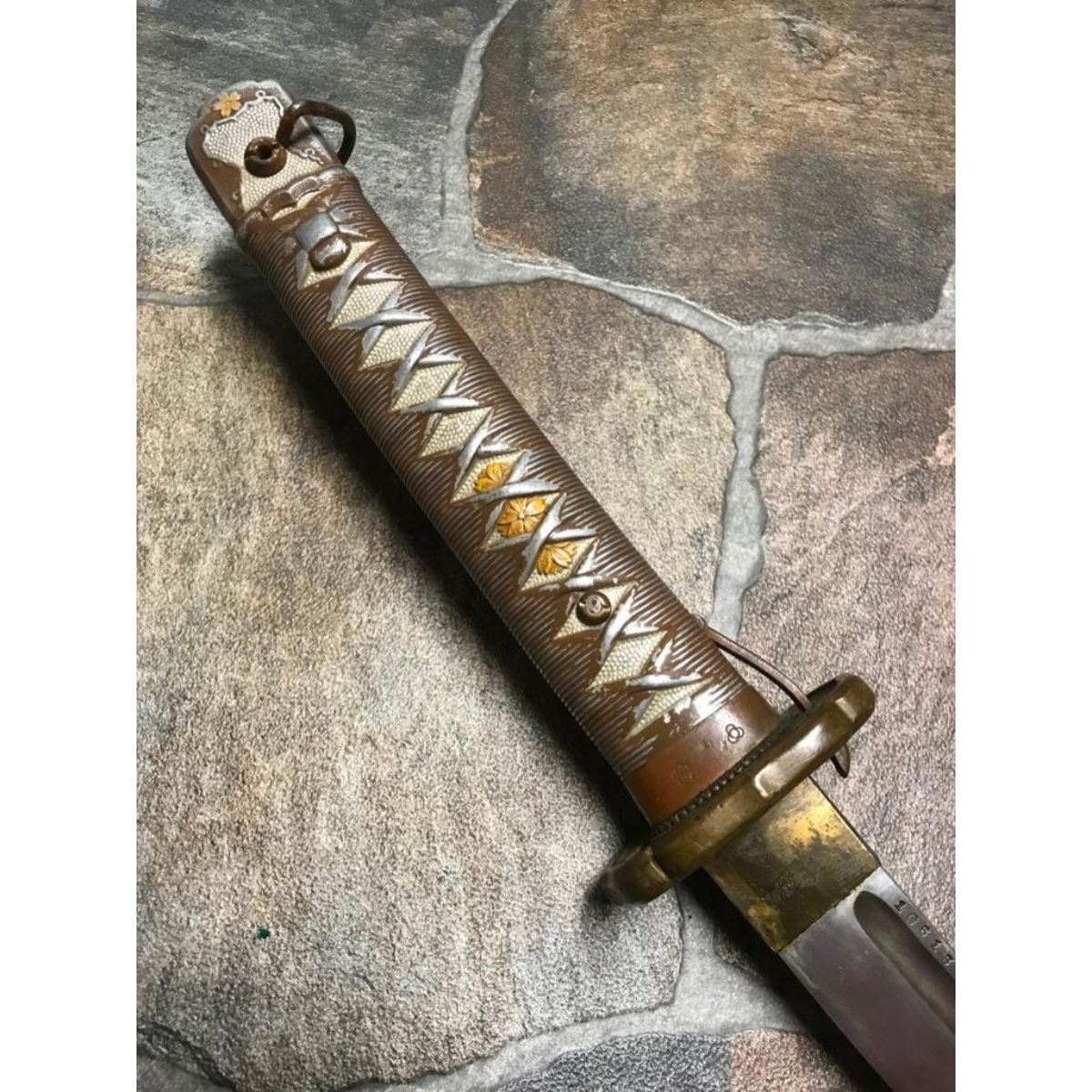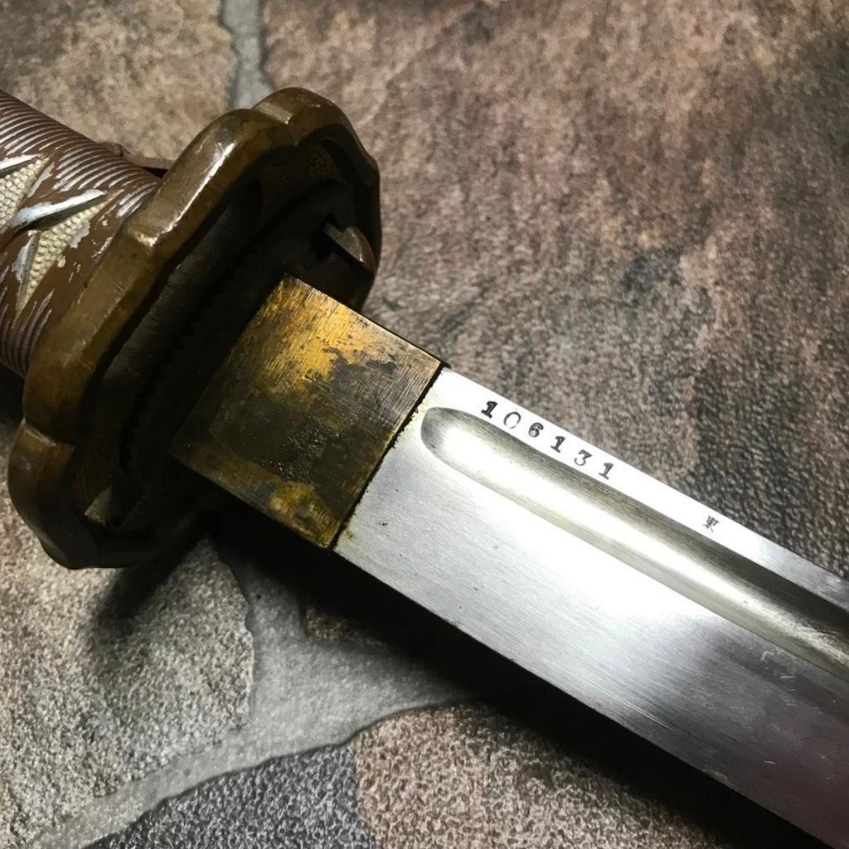 World War II Imperial Japanese Army Type 95 Shinto Gunto Katana Sword for a non commissioned officer, produced by The Tokyo First Arsenal. The copper fuchi bears a Tokyo First Arsenal sword maker’s stamp, Tokyo First Arsenal inspection stamp and a Kokura Arsenal identification stamp. The Kokura Arsenal did not produce any Type 95 Shin Gunto but over-saw the production of these swords by the Tokyo First and Nagoya arsenals so its identification stamp is sometimes found on Type 95 swords. The machine made grooved blade is in excellent condition with very minor pitting and tarnish consistent with its age and use. The serial number "106131" and a Tokyo First Arsenal stamp are clearly marked above the bohi (fuller). The serial number on the throat of the scabbard does not match that of the blade but this is quite usual. When sent to the armourer for sharpening, swords were often returned without their original scabbard and an active and regularly sharpened sword could go through a number of scabbard swaps during its service life. This sword has a cast aluminu tsuka (hilt) with a 9mm thick ornate brass tsuba (guard) with pebble finish, styled to look like cord wrapped rayskin with menuki and stamped behind tsuba with chrysanthemum and Tokyo arsenal marks. The fuchi is copper and the sword is secured in the scabbard by a top latch, all of which identifies it as being a third pattern sword dating to around 1938 – mid 1941. After mid-1941, the tsuba and fuchi were made of unadorned iron. Painted steel scabbard in excellent condition. Blade 26-2/8". Overall with handle 36-3/8â€. ** area of roughness to blade which is oiled & wear to paint on handle.