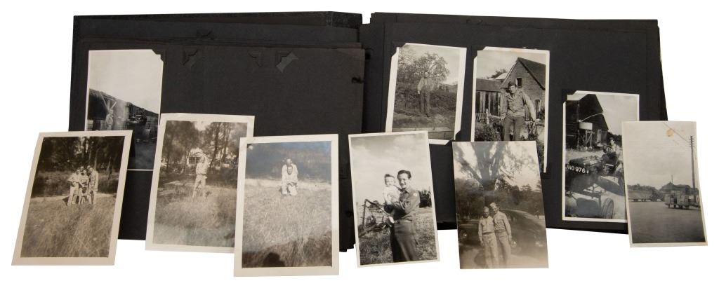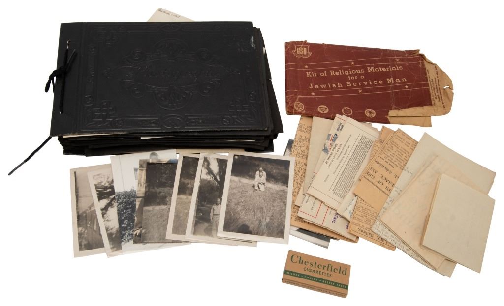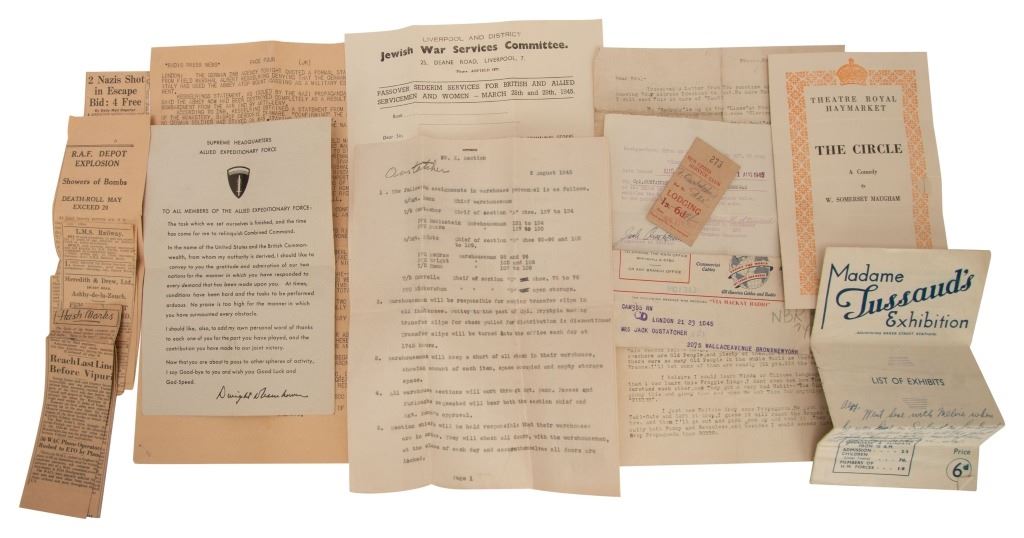 Item/Description: Collection of photos, ephemera, and mementos from Private First Class (PFC) Jack Oustatcher, a Jewish American US Military serviceman who was stationed in London during WWII. Includes a scrapbook album with black and white photographs depicting base and training life and photos from in and around London, England and overseas. Lot also includes 1945 assignment checklist / work orders, Chesterfield cigarette ration pack, a British propaganda poster featuring an excerpt from Winston Churchill's famous "We Shall Fight on the Beaches" speech, delivered to the House of Commons on June 4, 1940, during World War II. Other ephemera incudes an announcement for seder (Greenback Synagogue Liverpool), 1944 radio press news, newspaper clippings, Western Union Cable 1945, memorabilia from London a Jewish envelope. Plus a letter from WWI dated 1918. (Fort Bragg, US Army)