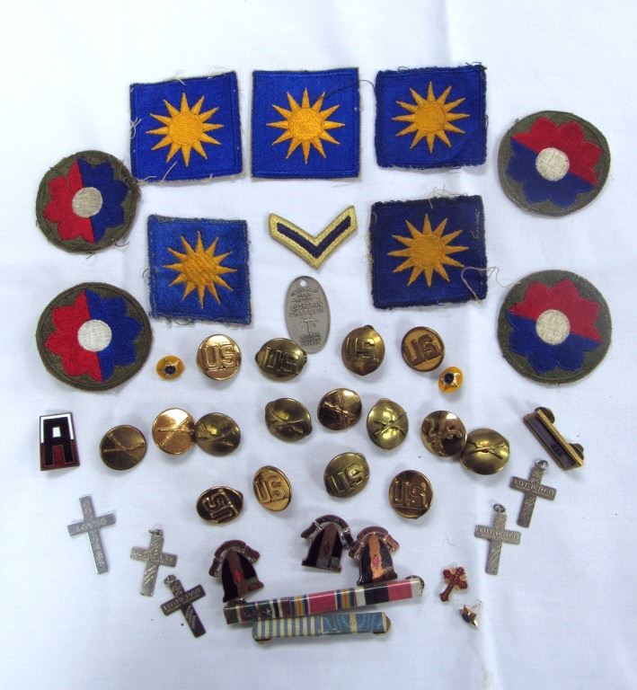 LAPEL PINS, & LUTHERAN CROSSES. X5 40TH INFANTRY AND X4 9TH INFANTRY SHOULDER PATCHES. X3 60TH INFANTRY UNIT CRESTS PINS AND (1) ARMY CREST PIN. 7 CROSS RIFLE, 1 CROSS PISTOL, & 8 US DRESS UNIFORM LAPEL