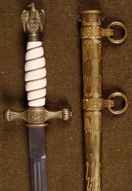 This is an original WWII era Krieges Marine Naval Dirk with lightning bolt scabbard. It has beautiful detail, with a double fullered Eickhorn blade with squirrel logo. The original washer is present below the crossguard. The grip is white with twisted * wire wrap, with eagle and swastika pommel. The blade length is 10 inches, and the overall length in the scabbard is 16 1/2 inches. The point of the blade is slightly bent, but otherwise this is in very good condition.