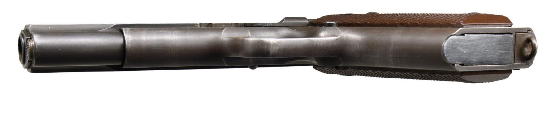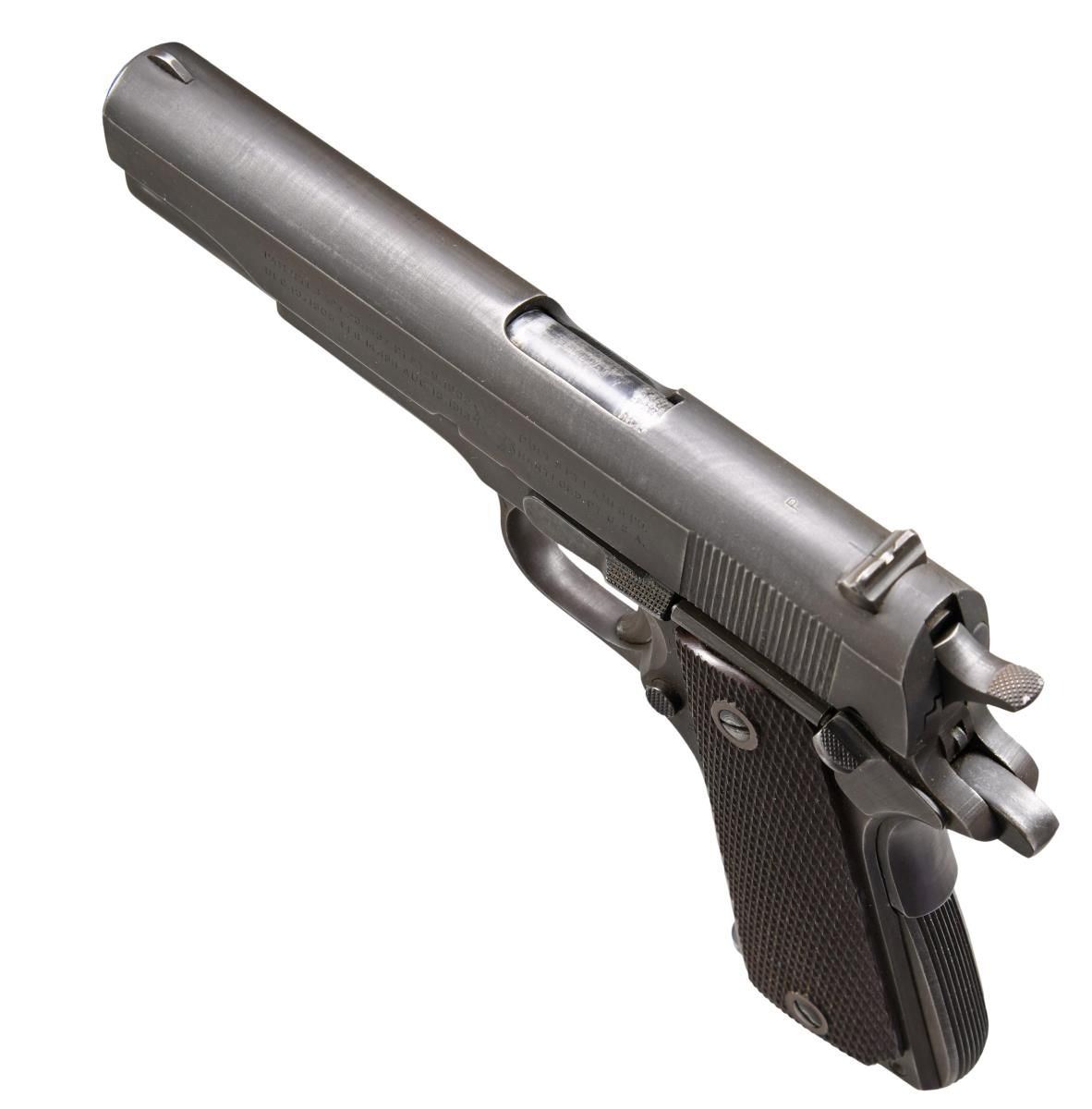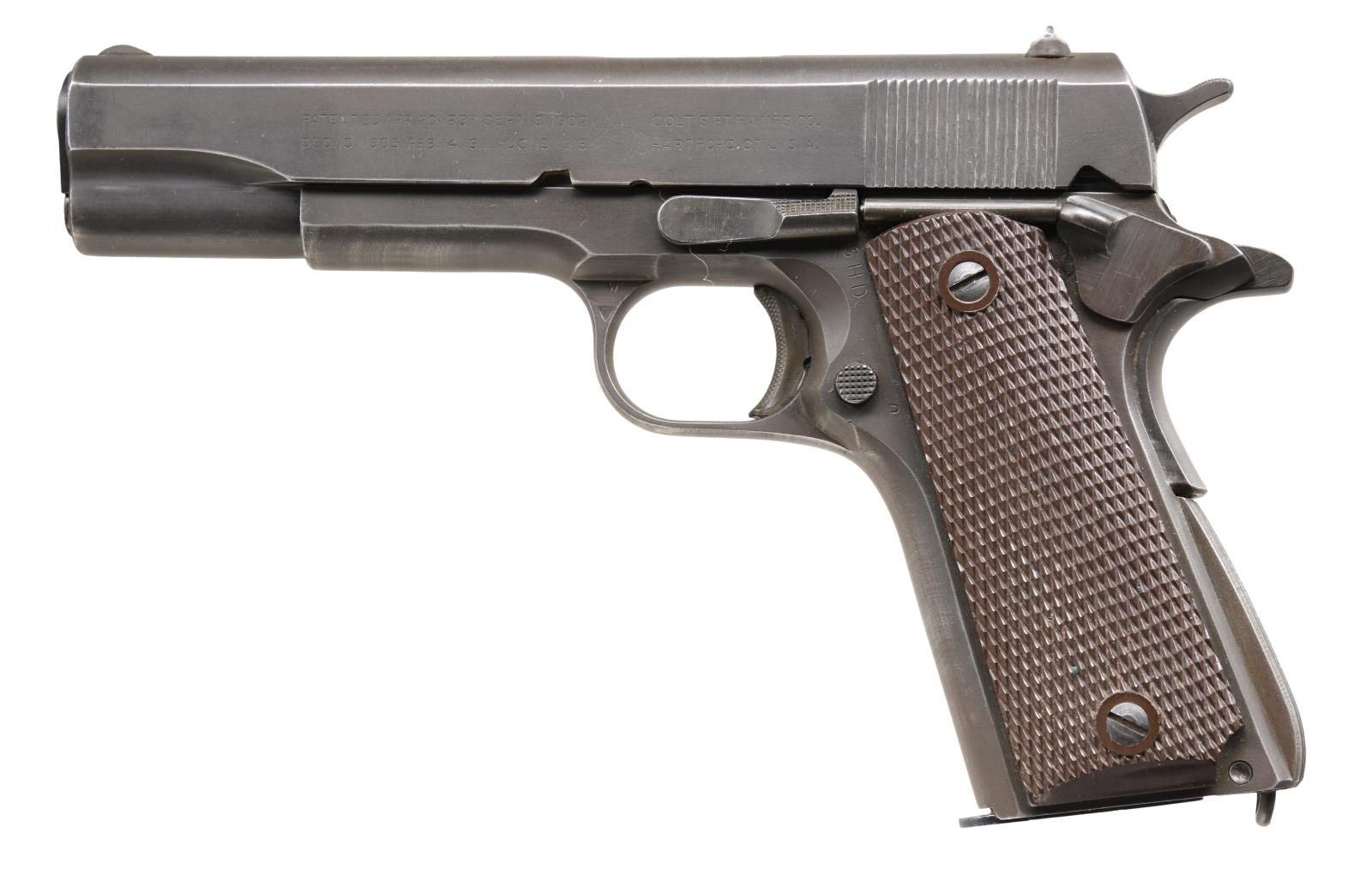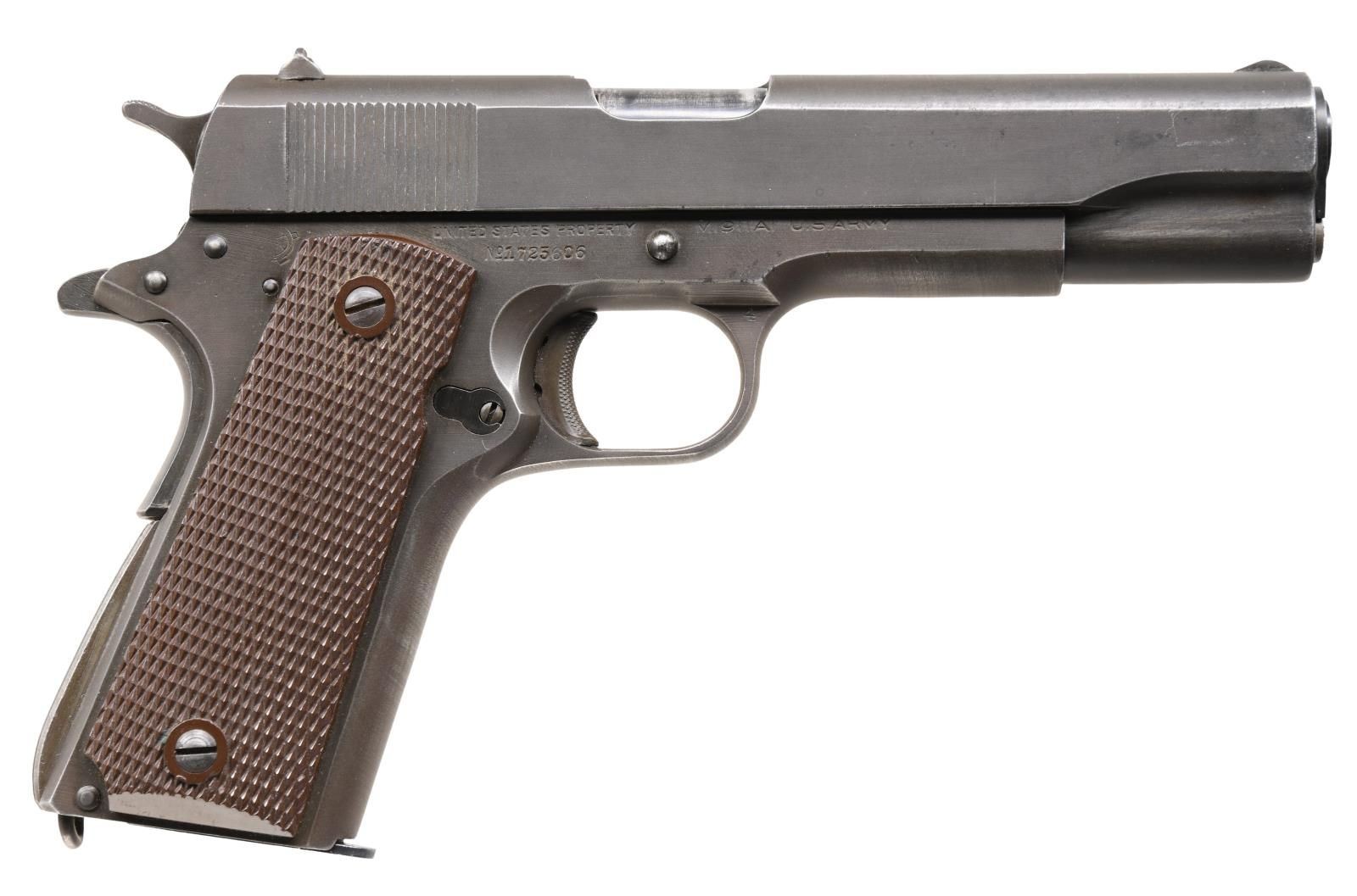 PISTOL. Cal. 45 ACP. S# 1725606 (mfg. 1944 w/in S# range 1,609,529 - 1,743,846). Correct features include: 5" Type 6 bbl., Type 7 Coltwood grips, Type E hammer, Type 4 arched mainspring housing w/ Type 2 Mainspring housing pin, Type C safety lock tab, Type B slide lock, beavertail grip safety, short 1911A1 trigger, Type C mag. release lock, Type 3 recoil spring plug, Type B recoil spring guide, Type C front & rear sights. MAGS: 1 Ridson for Colt & 1 M.S. Little 7 rd. mags. CONDITION: pistol has very good original parkerized finish w/ wear on edges & cycling areas, scattered spots of patina (mostly muzzle area of slide), slide lock wear, & light wear in carry areas. Very good grips. Very good bore. (23-5614/MD). CURIO. $1,500-2,250.