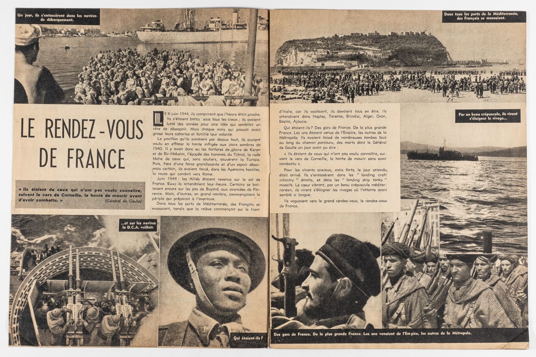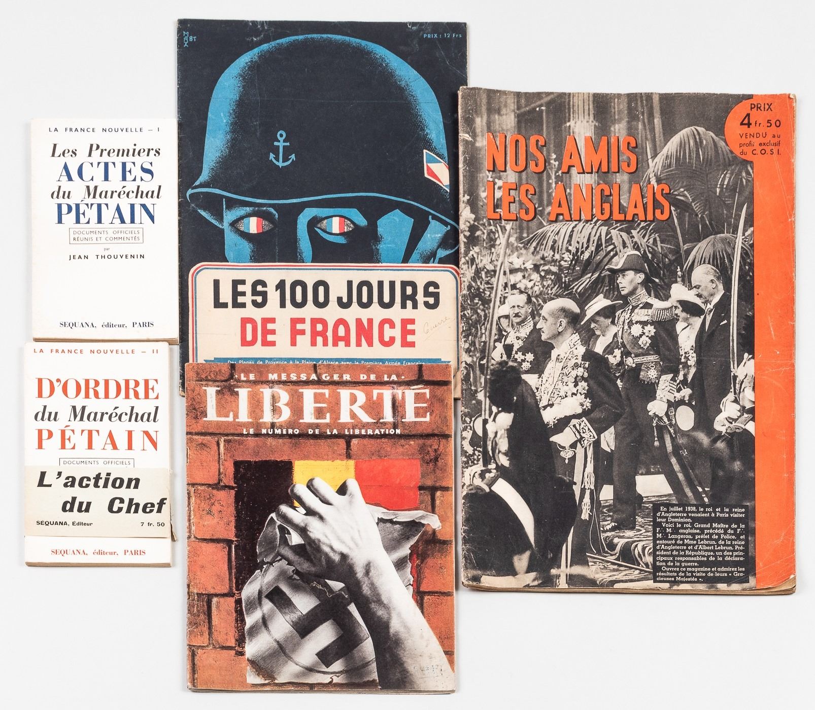 Three magazines on the liberation of France from Nazi Germany during WWII, including 'The Messenger of Liberty', 'The 100 Days of France', and 'Our English Friends'. Included with lot are two French books about Marshal Petain, 'Les Premiers Actes du Marechal Petain' and 'D'ordre du Marechal Petain', approx. 7.25 x 4 inches.