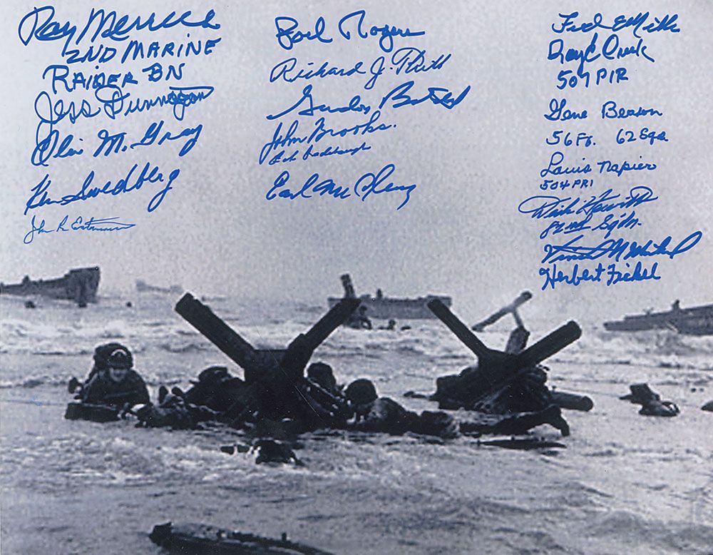 Satin-finish 14 x 11 photo of the D-Day invasion, signed in blue felt tip by Olin Gray, Earl McClung, Paul Rogers, Robert Radebaugh, Fred Miller, John Brooks, Roy Creek, Ray Merrell, Jesse Dunnagan, Gordon Batdorf, Louis Napier, Vincent Muirhead, Richard Hewitt, Kenneth Swedberg, Richard Thill, John Entenmann, Eugene Beason, and Herbert Fickel. In very fine condition. Accompanied by unsigned photos of most of the signers.