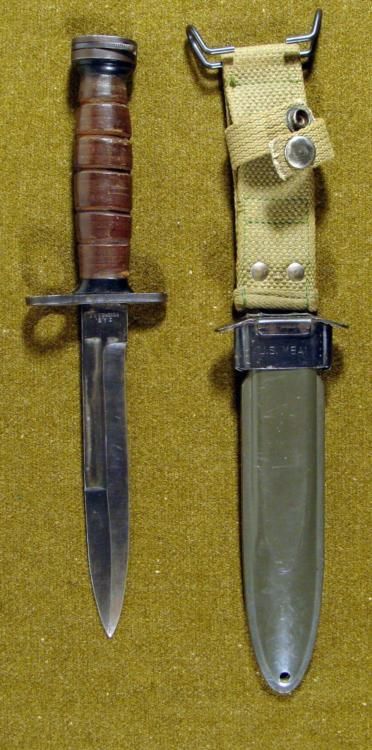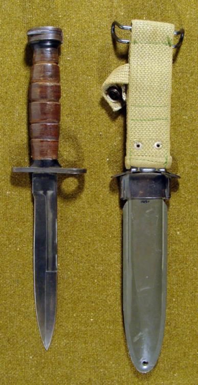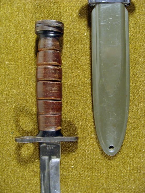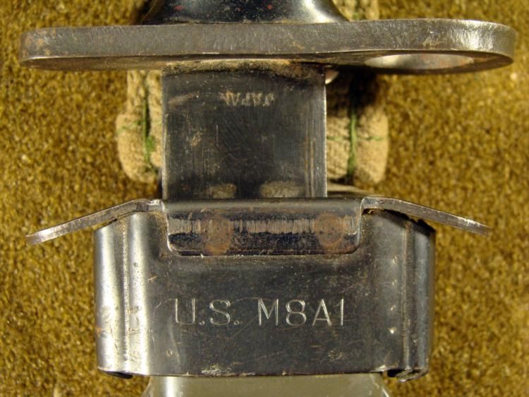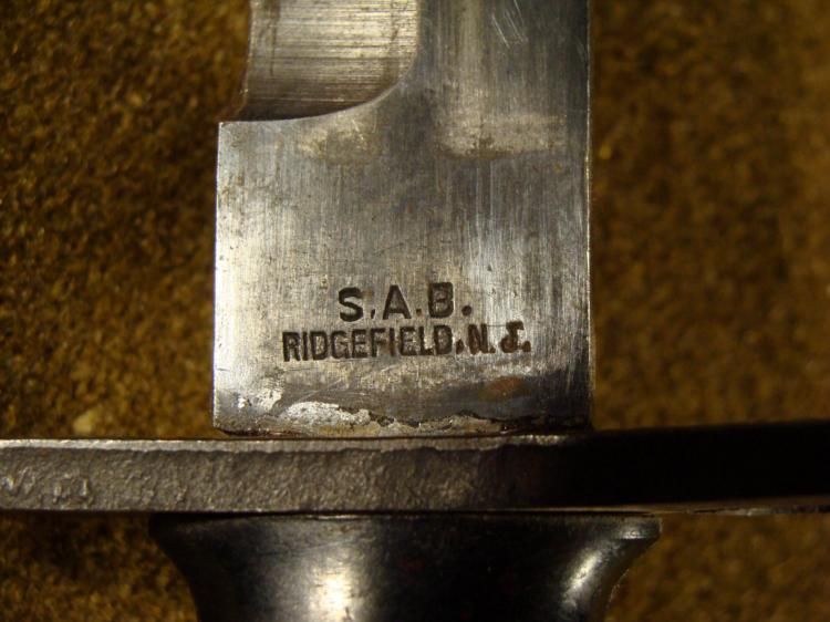 WWII M4 US BAYONET KNIFE-JAPANESE MADE W/M8A1 SCABBARD--SAB-RIDGEFIELD NJ * LEATHER WASHER GRIP-PARKERIZED BLADE-RICASSO MARKED "S.A.B.-RIDGEFIELD NJ" REVERSE "JAPAN"-SCABBARD MARKED-WEB TOP W/SNAP *