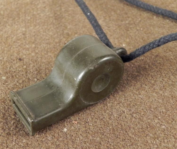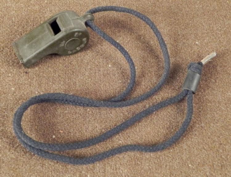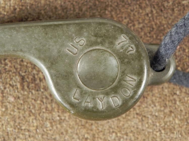 WWII MARINE DRILL SGT WHISTLE ON LANYARD * MARKED: US 77 LAYDON" *