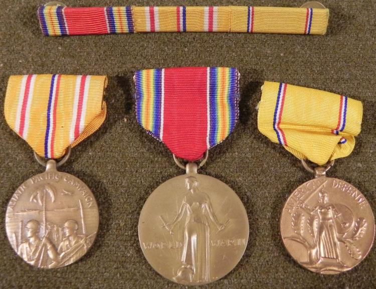 WWII MARINE GROUPING 3 MEDALS & MATCHING RIBBON BARINCLUDE WWII VICTORY MEDAL--ASIATIC PACIFIC CAMPAIGN MEDAL & AMERICAN DEFENSE MEDAL FOR SERVICE PRIOR TO OUR INVOLVEMENT IN WWII