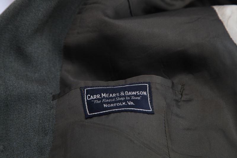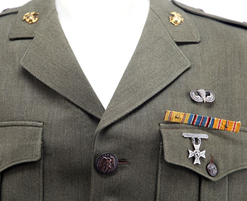 Jacket is made by Carr, Mears & Dawson in Norfolk, VA. Jacket is marked on the shoulder with Captain bars and on the right sleeve with a theater-made patch on red felt. Jacket is also awarded with a sterling Pistol Sharpshooter, and a sterling airborne wings. Ribbon bar includes Asiatic Pacific Campaign American Defense Service, and American Campaign medals. Overall the jacket is in very good condition.