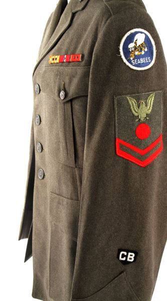 WWII US Navy Sea Bee tunic. Sea Bee and striker patches on sleeves, EGA's on collar, and service ribbons. Overall very good condition. Likely enhanced with some period insignia.