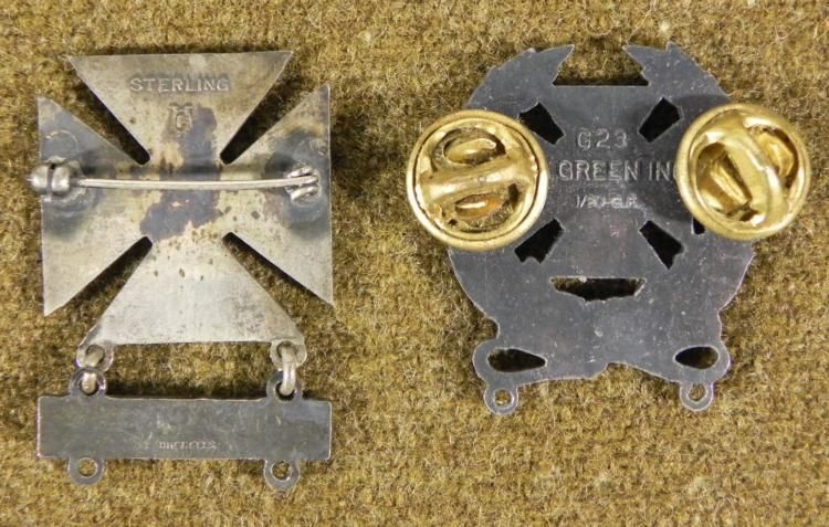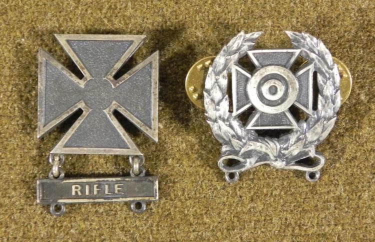 WWII MARKSMAN BADGE WITH RIFLE BAR (BOTH STERLING) + EXPERTQUALIFICATION BADGEEQB IS CLUTCH BACK--MB IS PINBACK