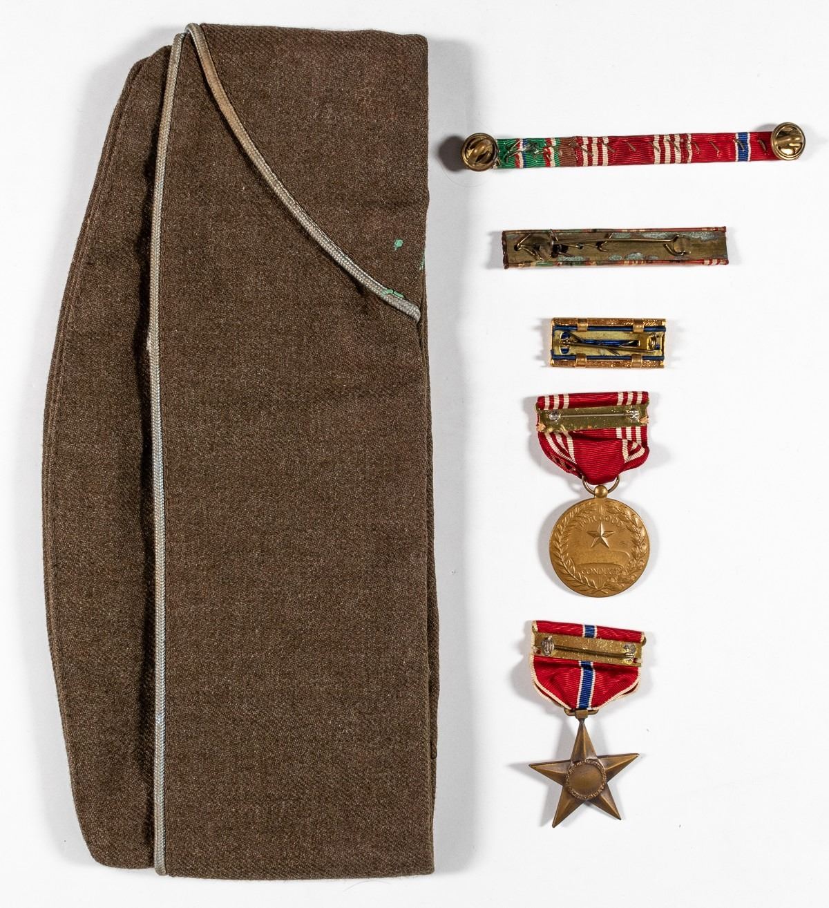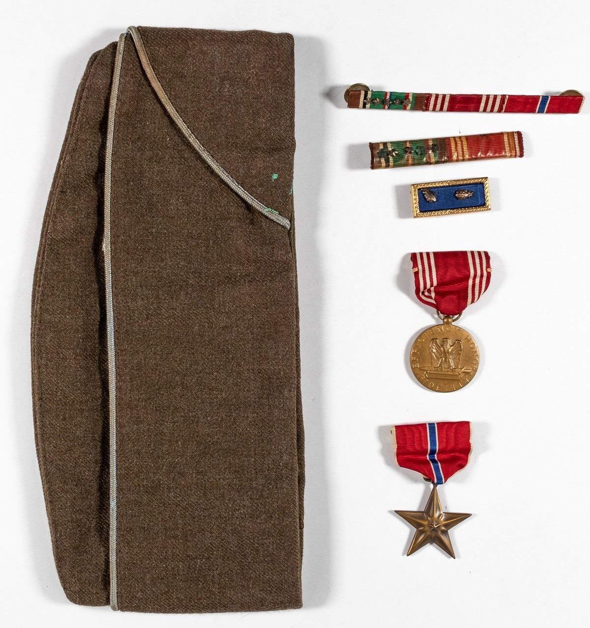 WWII ribbon bars for Good Conduct, Europe, Africa, Middle East campaign, Bronze Star, and Presidential Unit with two Oak Leaves. Some bars have stars. Included with lot is a WWII garrison cap, inscription on inside 'Meimbresse'. Minor soiling.