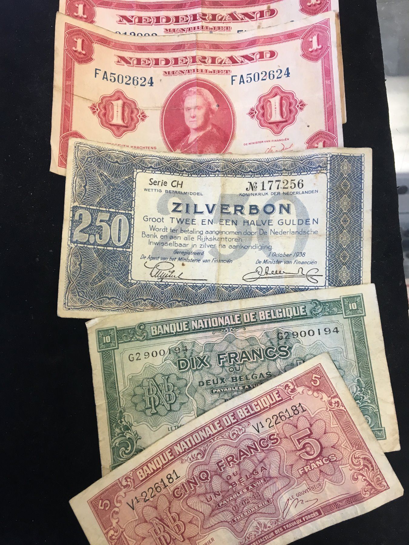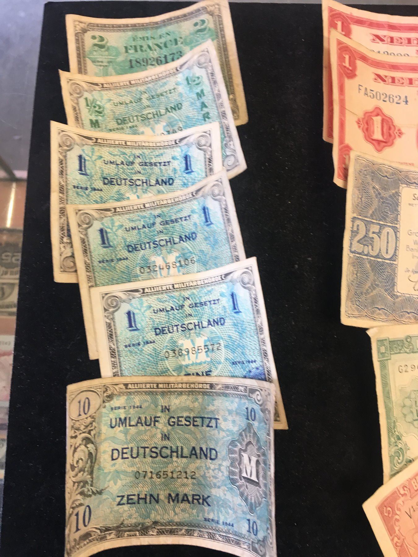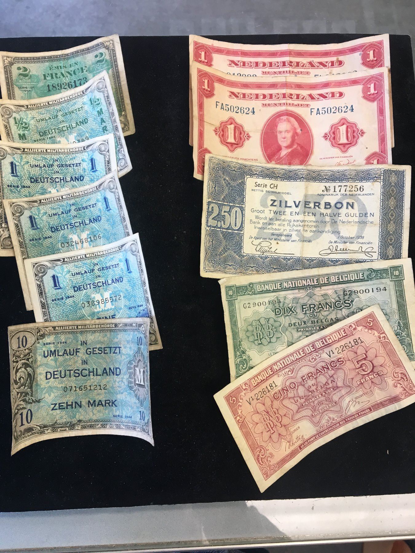 NICE LOT OF MILITARY WWII CURRENCY.GERMANY,FRANCE,BELGIUM,HOLLAND..NICE MIXED LOT OF 11 NOTES.VG-F