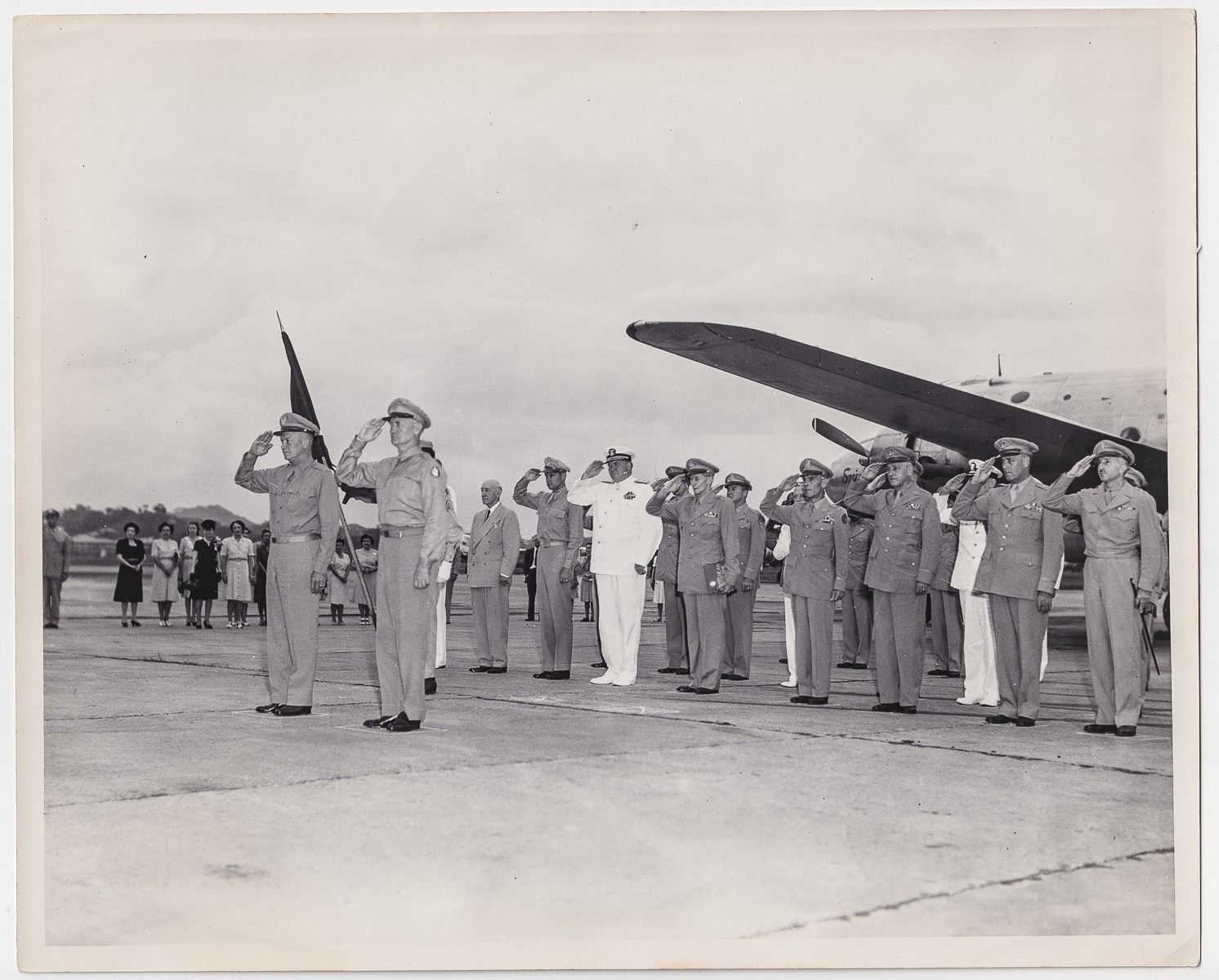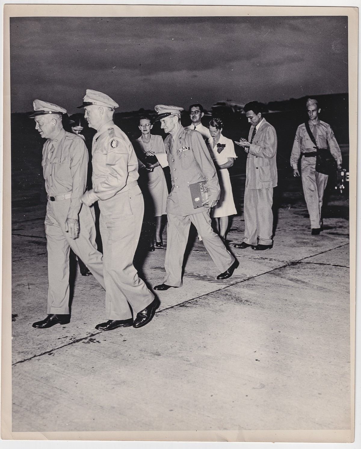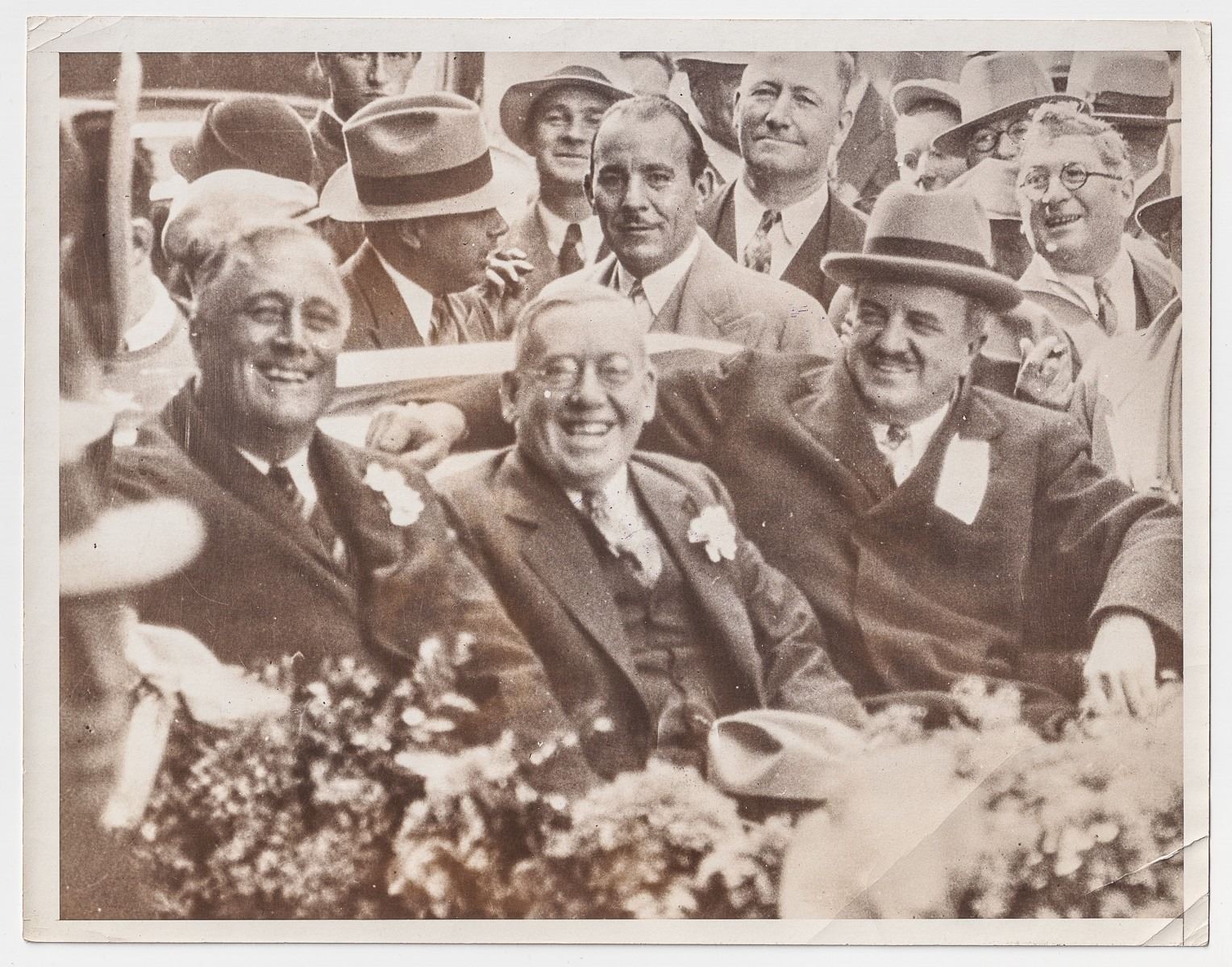 Group of eight press photographs of President Franklin D. Roosevelt, Viscount General Gort, General Dwight D. Eisenhower, Mayor John F. Dore, Senator Clarence Dill, and other soldiers. Approx. 8 x 10 inches. Some photographs have inscriptions and papers adhered to their verso.