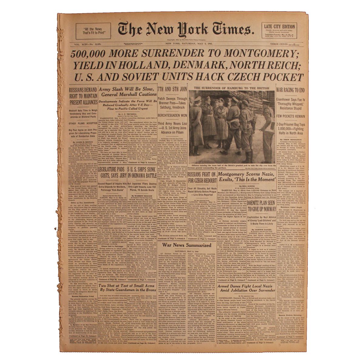 5 May 1945 issue of ''The New York Times,'' announces ''500,000 More Surrender…'' and features a picture of the German surrender at Hamburg. One headline quotes Eisenhower stating that the enemy is ''thoroughly whipped''. The paper, which measures 16.5'' x 22.5'' and runs 28pp., also has several photos of Nazis surrendering to the Russians. Some toning and significant chipping along the left bound edge; front page is separated from binding. Overall very good condition.