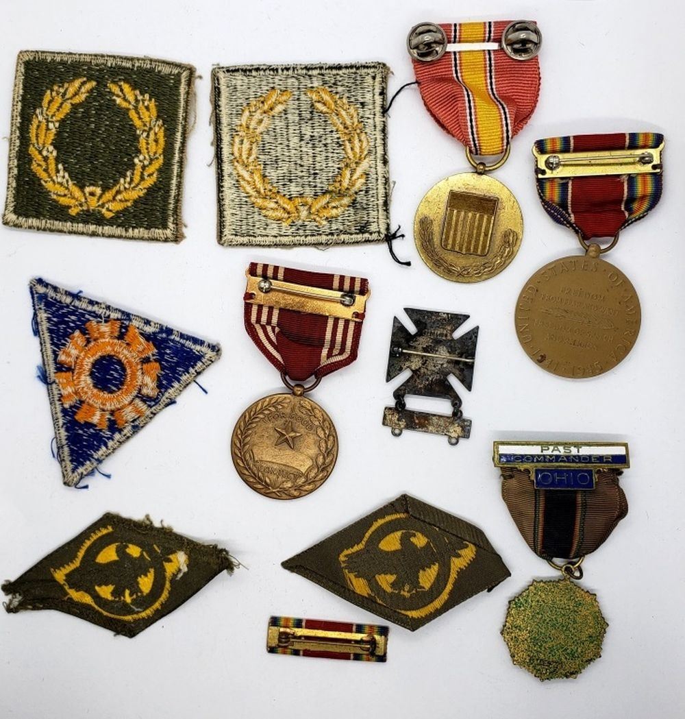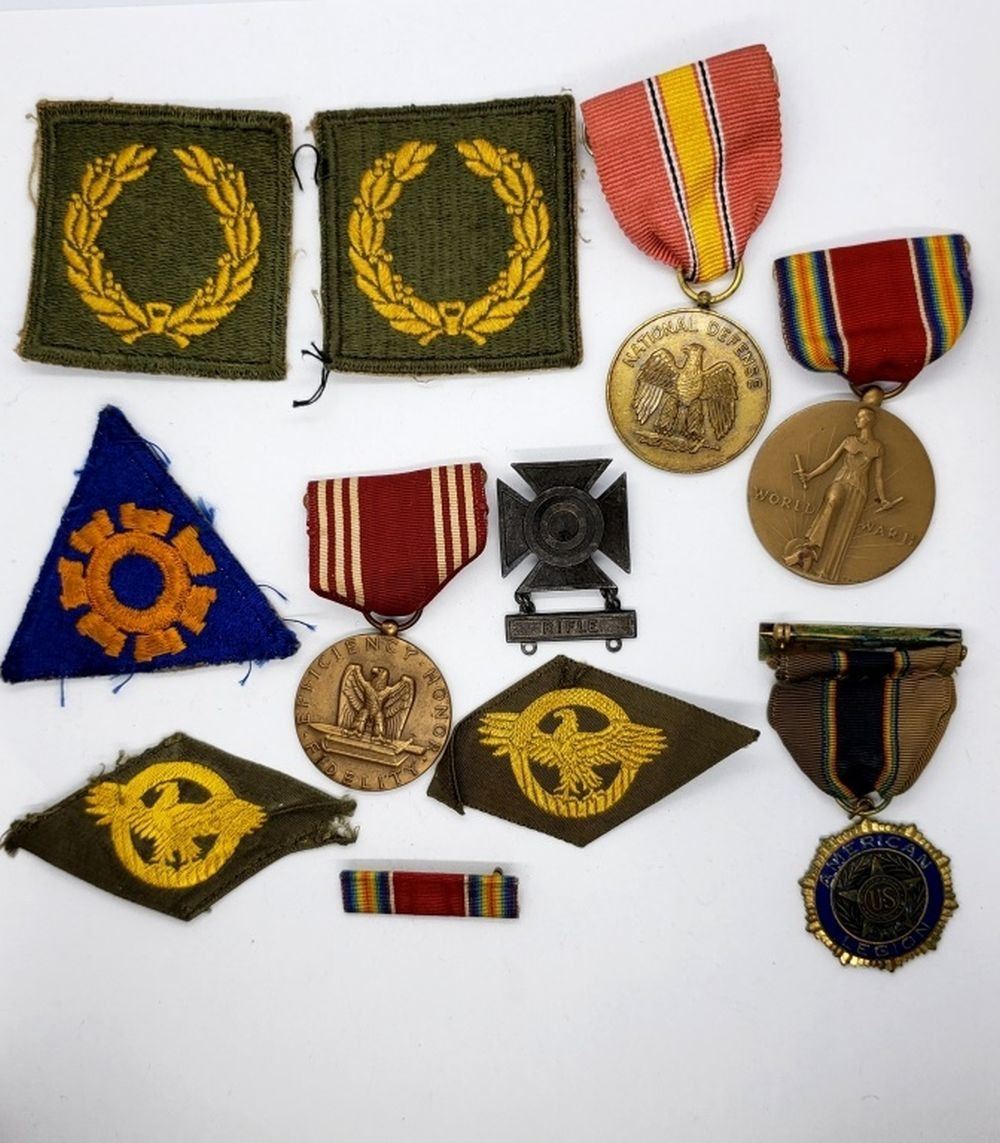 Also included is a past commander of the Americain Legion medal, sterling silver sharpshooter badge with rifle bar, and some various patches.