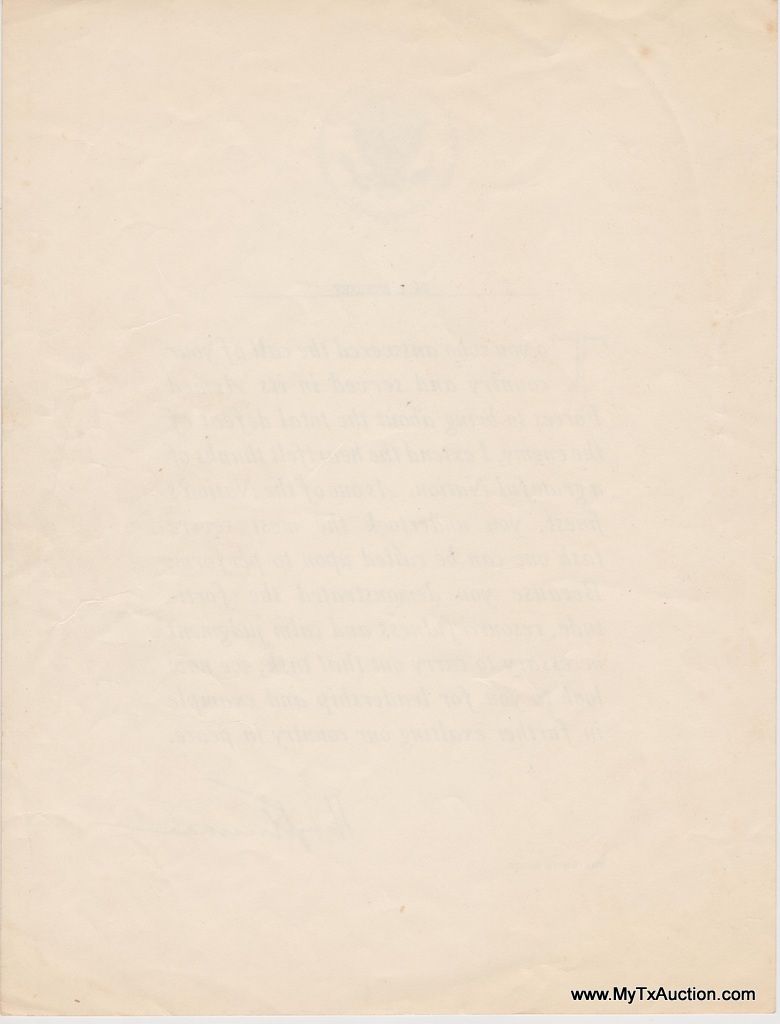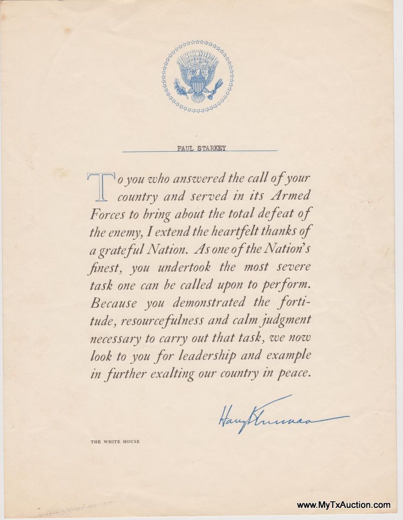 You are bidding on a WWII document that was auto pen signed by President Harry Truman. This document from The White House was presented to Paul Starkey thanking him for his service to his country. The paper is yellowed from age. Great chance to own a piece of history.