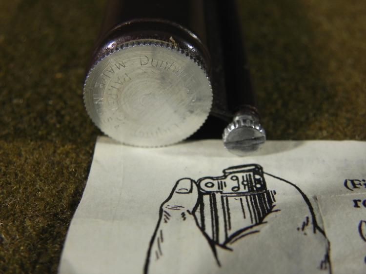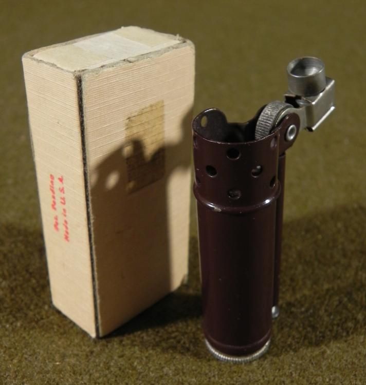 This WWII Military Trench Lighter is in Mint condition, and comes in the original box with directions. It has not been tested with fluid. It is dark brown in color, and the box has textured paper. The size is 2 3/8". * * This is a perfect example of a fine WWII lighter.
