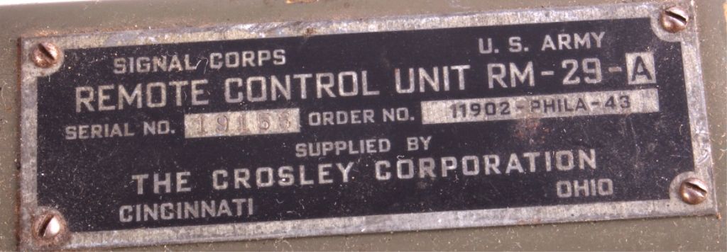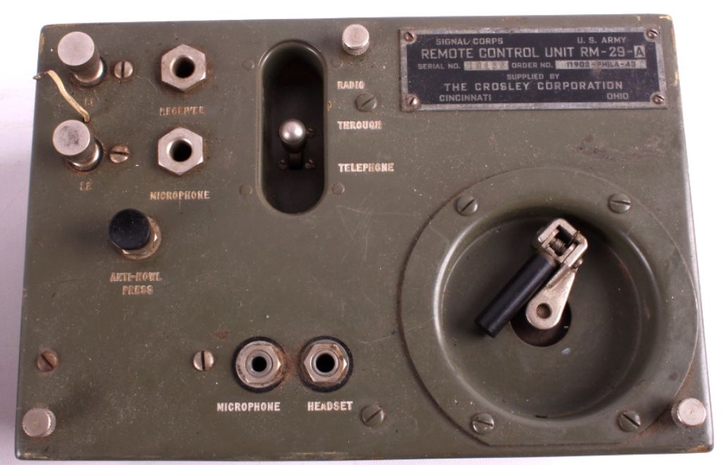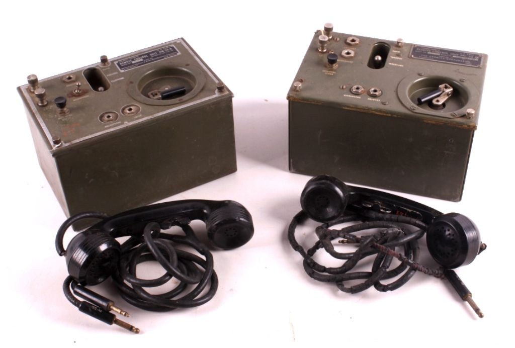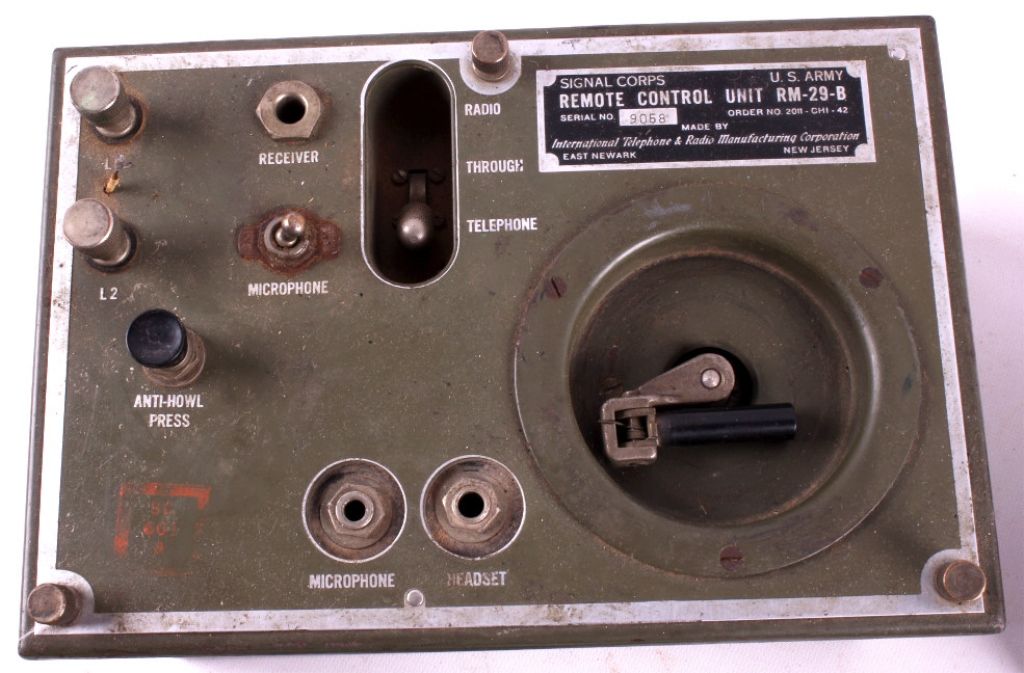 This is a pair of WWII U.S. military remote control units. These were used by front line observation forces to relay information to command units in the rear. One unit is marked "RM-29-A" and the other is marked "RM-29-B". Each comes with a TS 13-C handset. The remote control units are in good condition. They each measure 9" x 6.5" x 6".