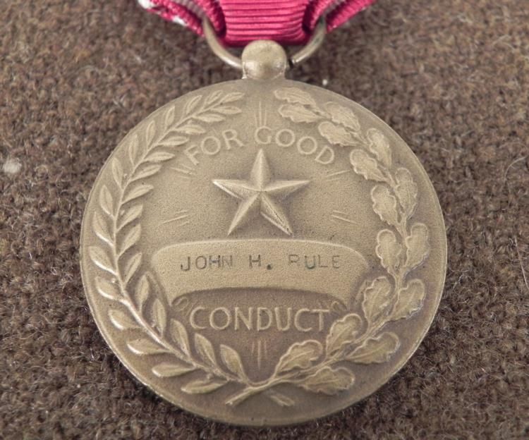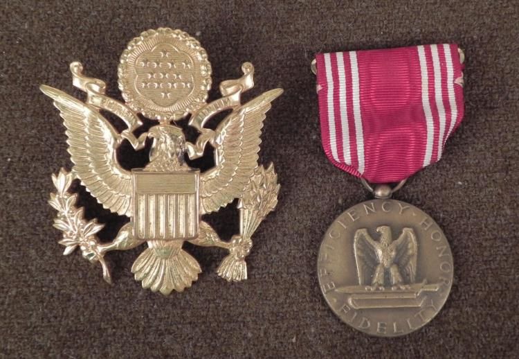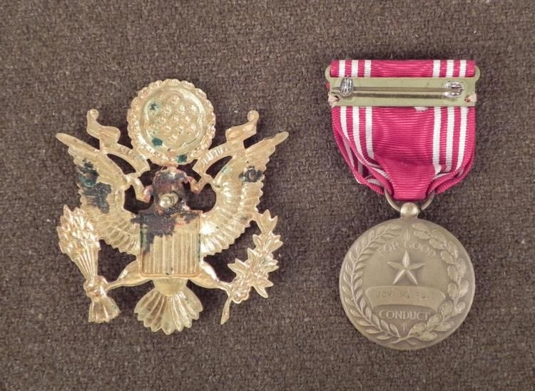 WWII NAMED GOOD CONDUCT MEDAL & OFFICER'S VISOR CAP EAGLE INSIGNIA NICE OFFICER'S MEMENTOS