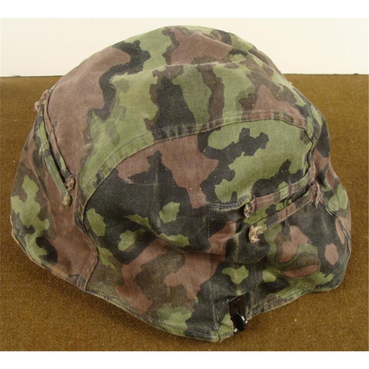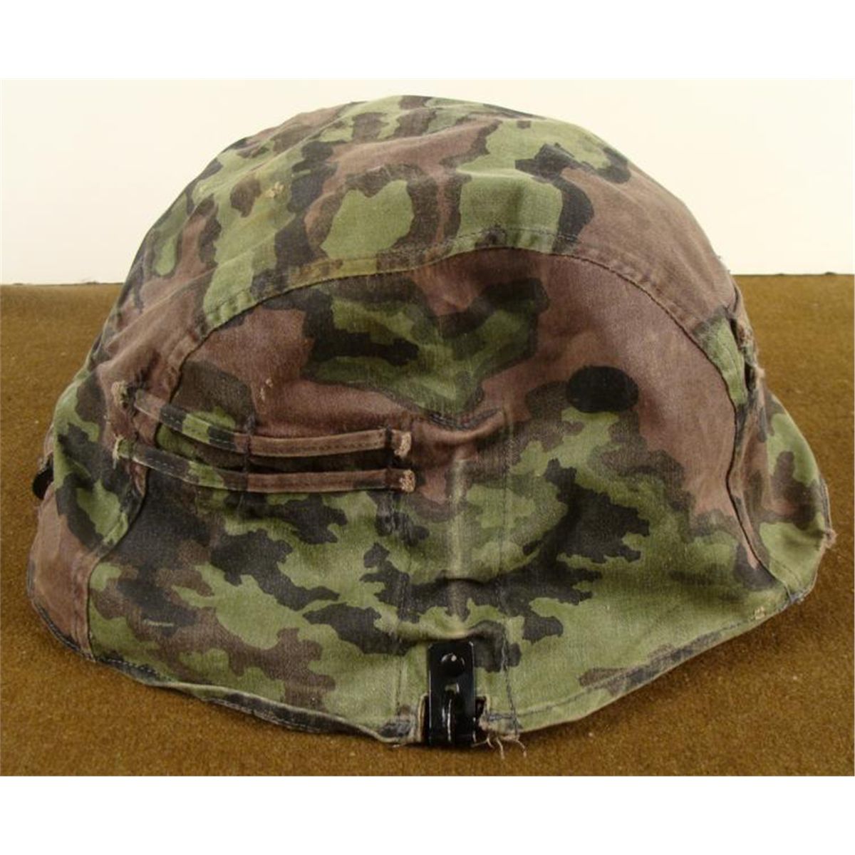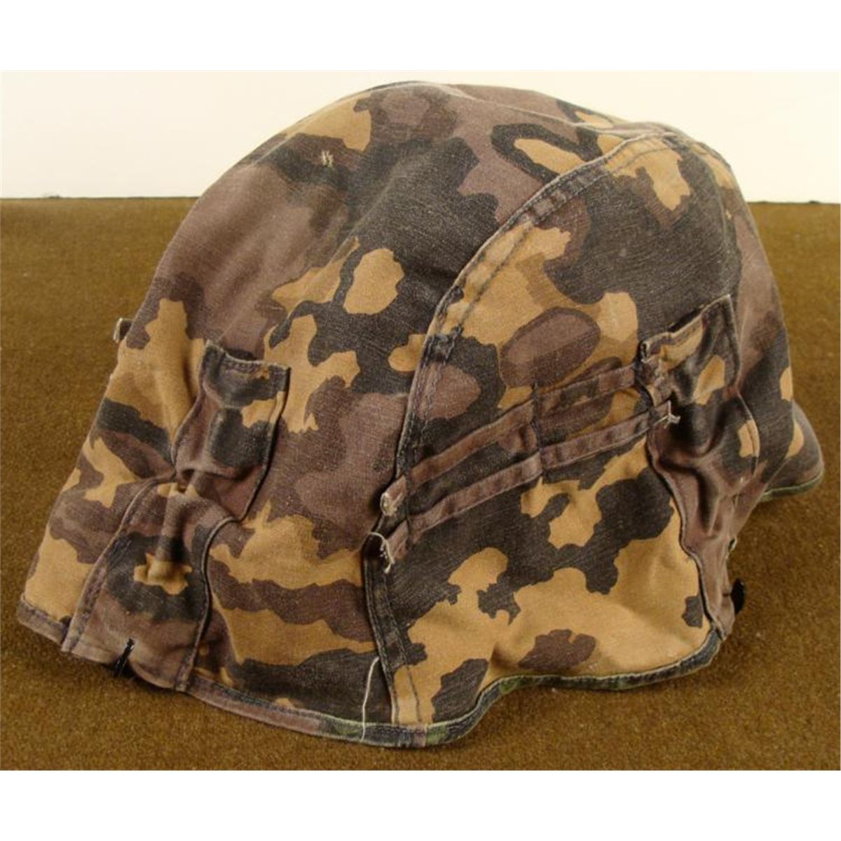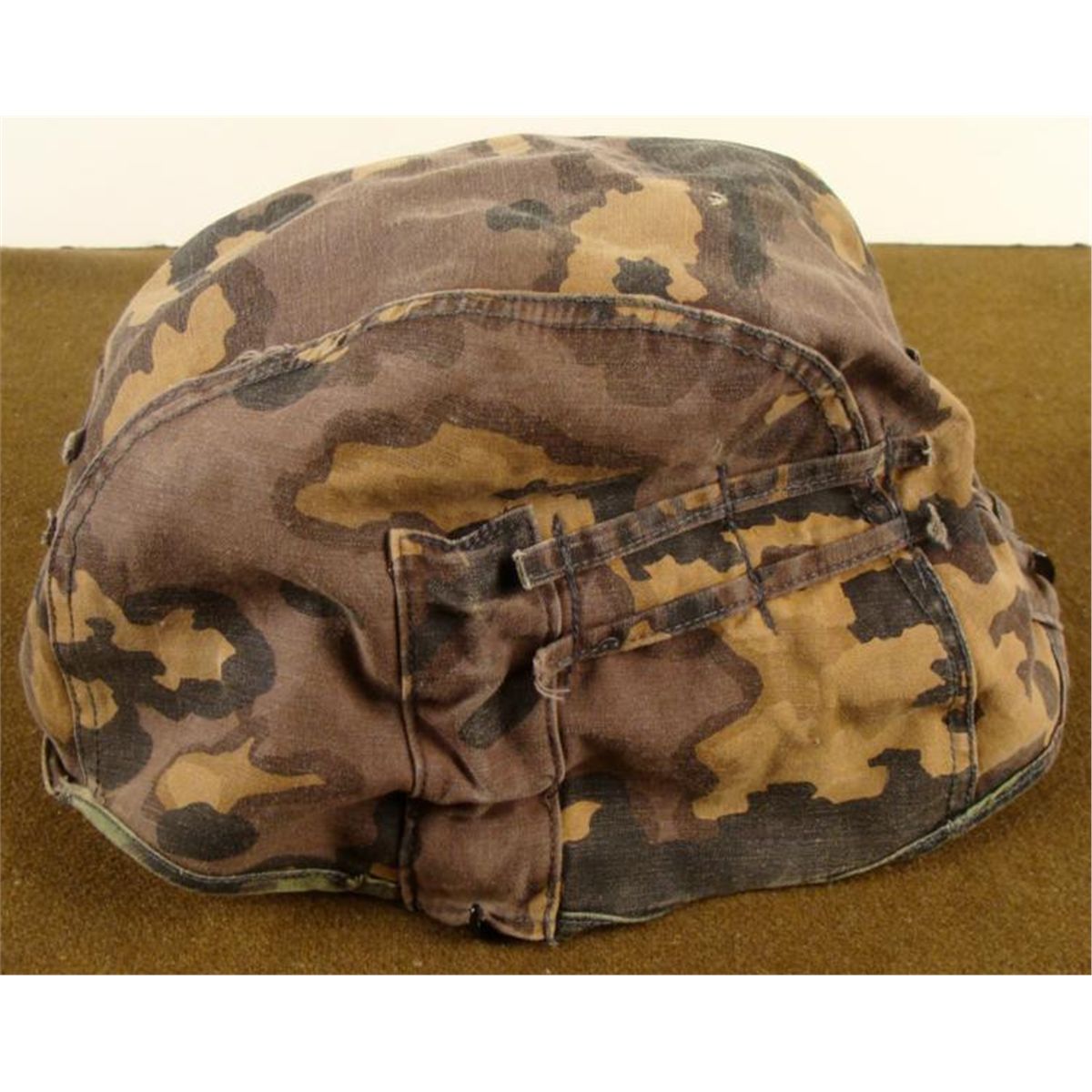 HERE IS A WWII NAZI GERMAN HELMET REVERSIBLE CAMOUFLAGE COVER. THE COVER IS AN EARLY & LATE FALL COLOR. IT IS IN VERY GOOD CONDITION, BUT SHOWS SOME WEAR. IT IS REVERSIBLE, WITH ONE SIDE THAT HAS A LIGHTER BLOTCH CAMOUFLAGE PATTERN AND THE OTHER IS SIDE HAS A DARKER ONE. IT HAS SEWN STRAPS ON EACH SIDE FOR FOLIAGE INSERTION AND COMES WITH 3 METAL HOOKS AROUND BOTTOM FOR HELMET ATTACHMENT. * * *