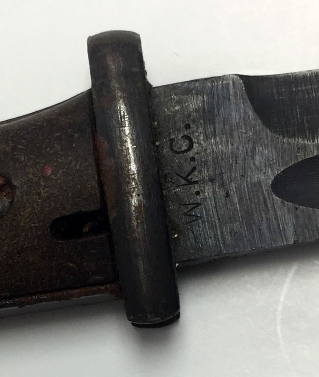 BAKELITE HANDLE. MARKED ON BLADE IS WKC. STEEL SCABBARD. SOME SURFACE RUST ON THE HANDLE AND SCABBARD BUT THE BLADE IS NICE. 385MM (15.157 INCHES).