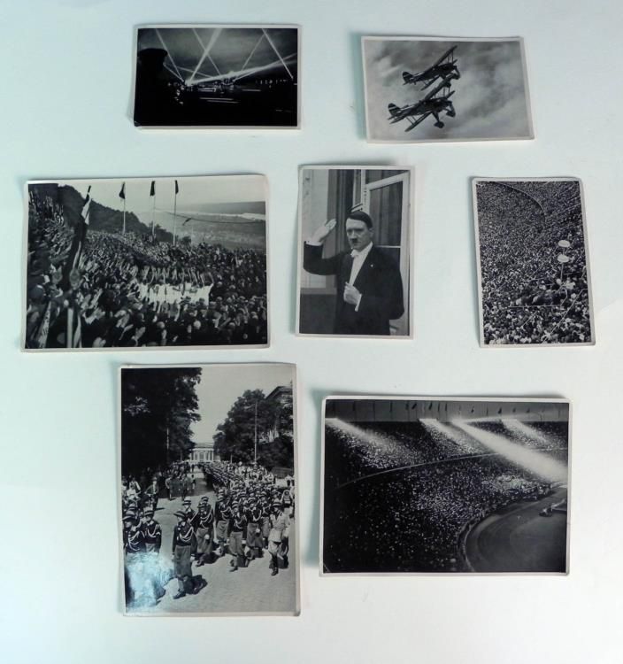 WWII NAZI PHOTOS OF HITLER, RALLY PARADES - LARGE FORMAT3 ARE 4.5" X 6.5" - 4 ARE 3" X 4.5" - ALL HAVE GERMAN DESCRIPTIONS ON REVERSE - ALL ORIGINAL PERIOD - 1 SHOWS HITLER IN FORMAL DRESS