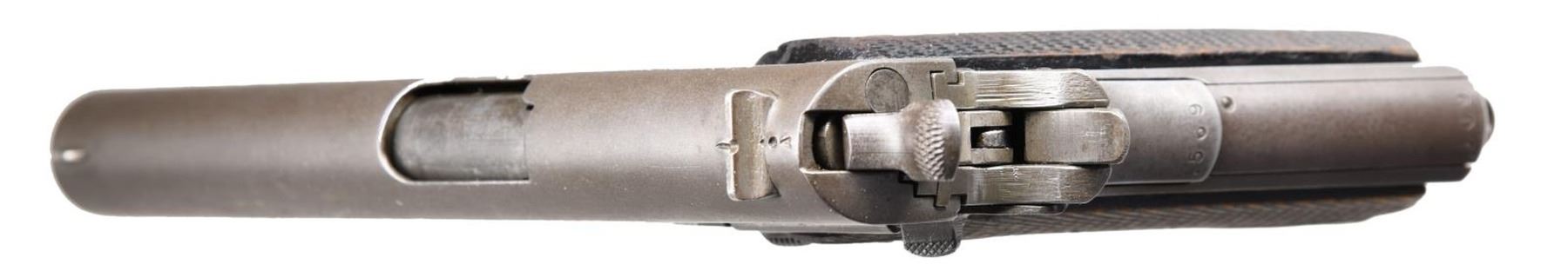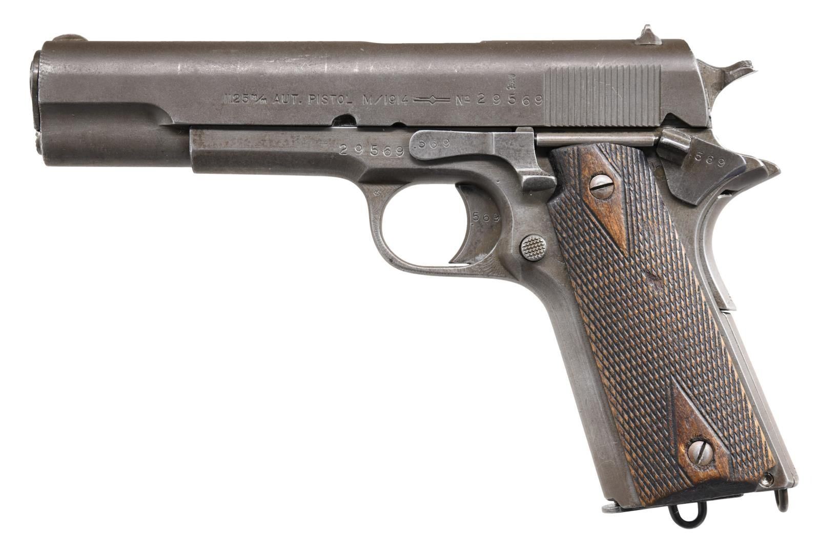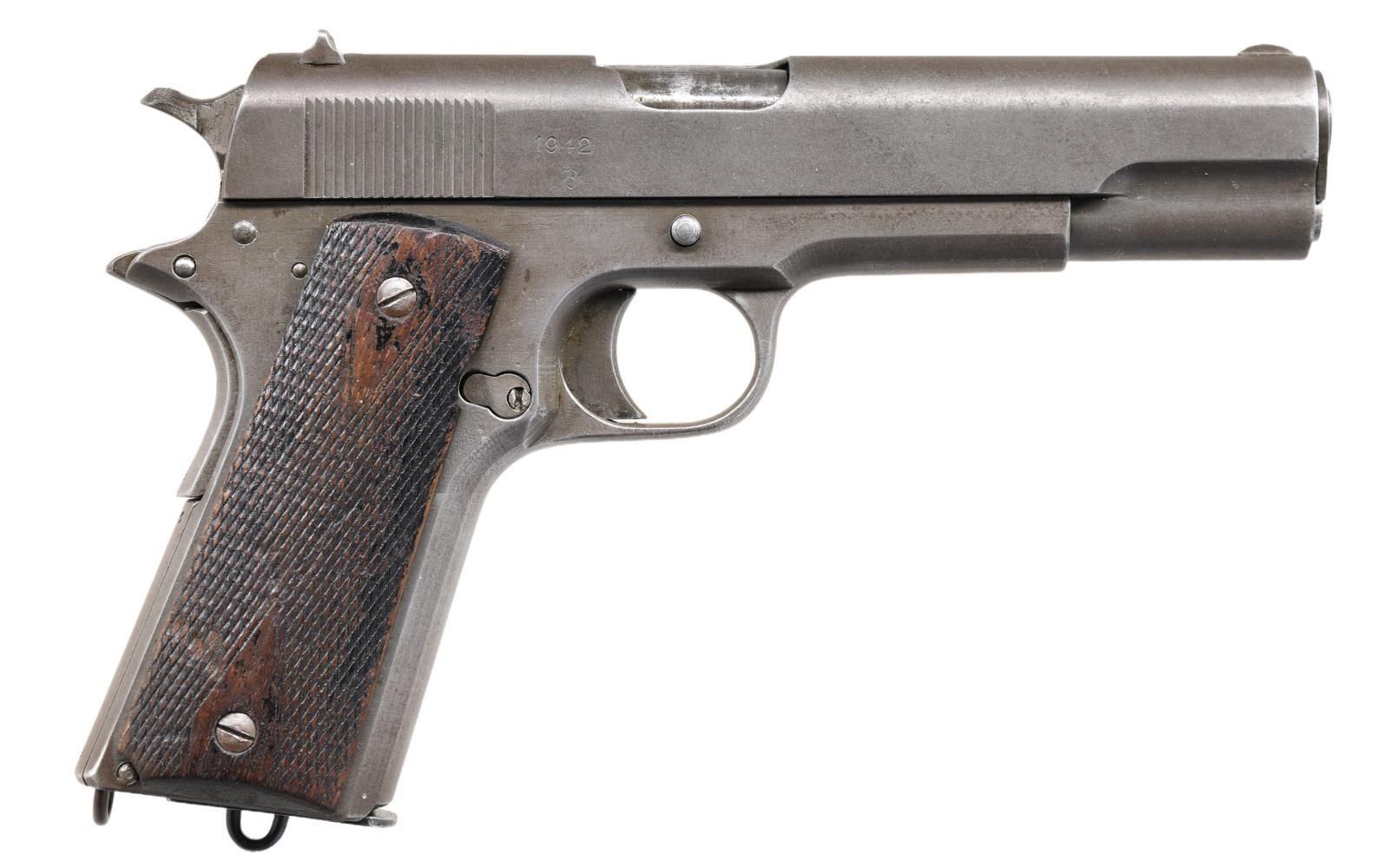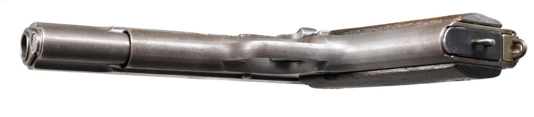 Cal. 11.25mm (45 ACP). S# 29569 (1942). Mfg. during the German occupation of Norway during World War II. Matching number ".569" marked on the 5" barrel, slide, trigger, hammer, thumb safety, slide lock, grip safety, & mainspring housing. Black stained double diamond wood grips. Top of slide has punch mark & "A". MAGS: 1 blued 7 rd. with lanyard loop. CONDITION: exterior finish has dull arsenal refinish over prior pitting & marks. Good left grip panel, fair worn right grip panel. Magazine has good original blue. Barrel has fair faded blue & fair bore w/ pitting. (24-1525/MD). CURIO. $1,800-2,700.