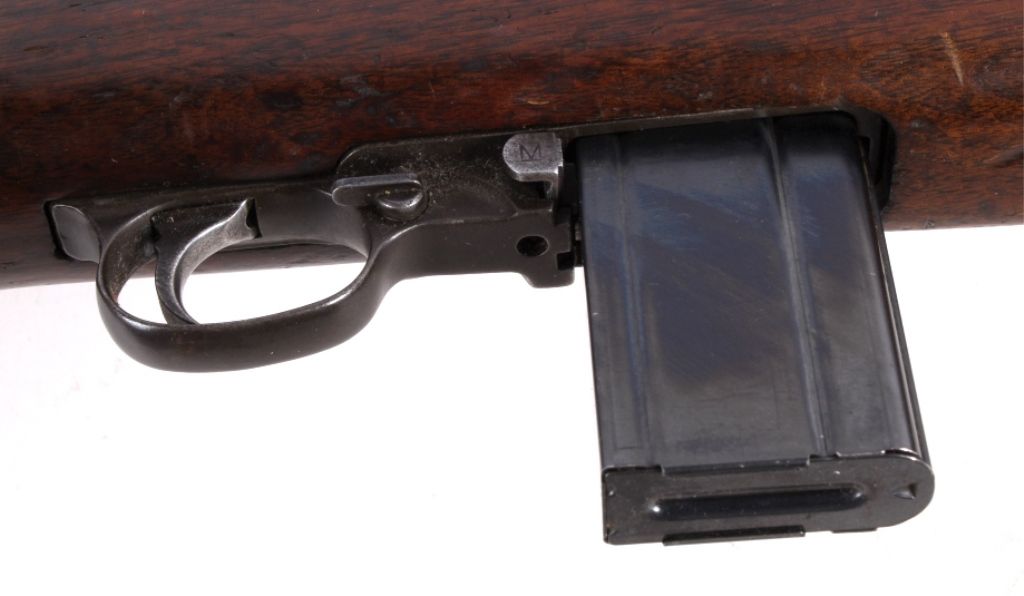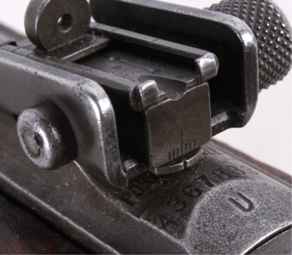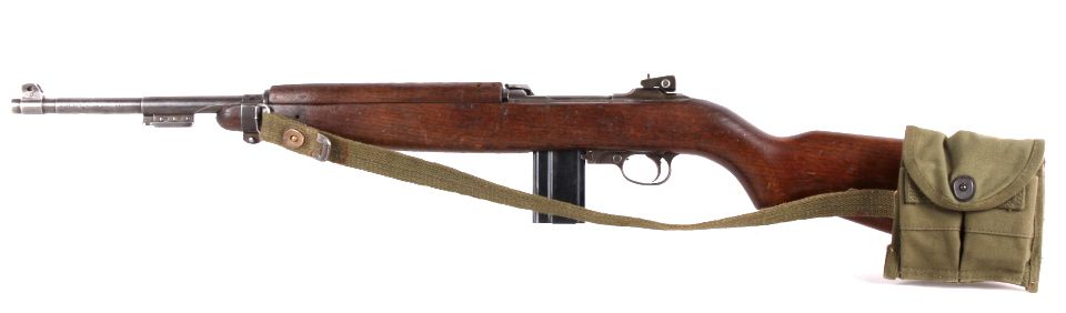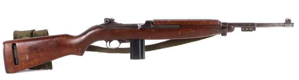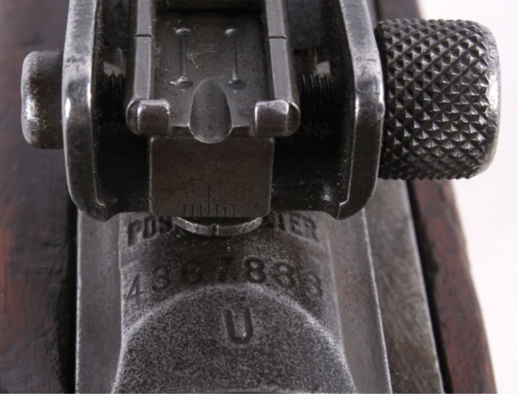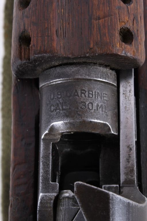 This is a very rare World War II United States M1 Carbine .30 caliber made by the National Postal Meter. The rare gun is in all original un-refinished condition and shows the correct sling and two clips. This combat used firearm shows wear across the wood and metal, but overall good solid condition (functions). The adjustable sight is marked I.R.C.O. 7160060. The top of the receiver is marked “U.S. Carbine Cal .30 M1.” Under the sight the carbine is marked “National Postal Meter 4367833”, manufactured from Dec. 1943 - May 1944. The barrel is marked, "Blue Sky / Arlington VA."