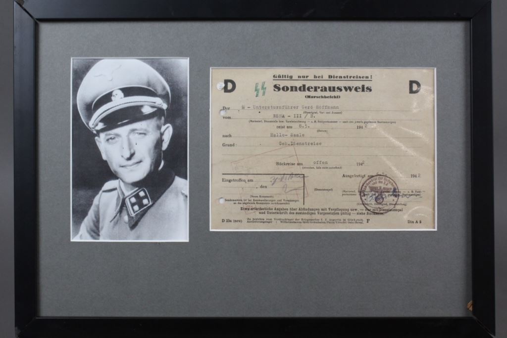 WWII Nazi Adolf Eichmann Signed Sonderausweiss. Adolf Eichmann is notorious for being one of the major organizers of the Holocaust. He was ordered with organizing and facilitating the logistics needed to deport Jews to ghettos, concentration camps, and extermination camps. Adolf Eichmann escaped to Argentina and hid from justice before being found in 1960. He was extradited to Jerusalem, Israel for trial and executed by hanging in 1962. The SS Sonderausweiss is a special pass, similar to a visa or passport. It allowed safe passage of the recipient in and out of Nazi Germany and had to be signed off by a member of the SS. Signature is clear and distinct, Sonderausweiss is yellowed with age and wording is slightly faded. Good condition and a great example of a lesser known piece of Nazi history. From the Michael Clifton collection. Frame size: 17 1/4" x 12 1/8" Photo: 4 1/8" x 6 5/8", Document: 8" x 6"