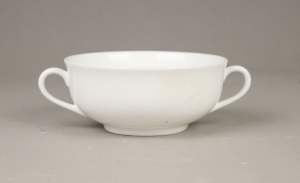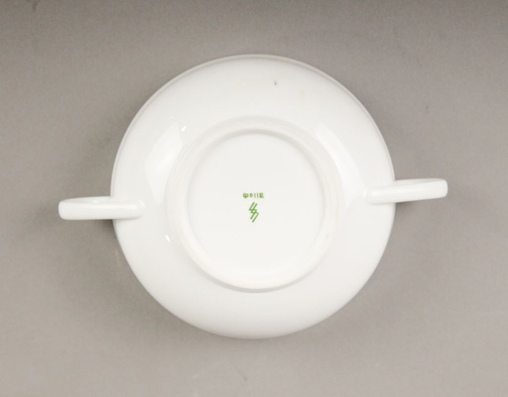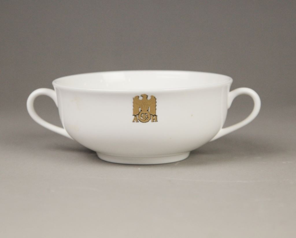 Adolf Hitler Porcelain Cup. This cup was a part of Hitler’s dining ware that he used at his various places of residence. This cup has a variation of the formal AH monogram in a gold color outlined in black. This cup also has the SS Allach manufacturer’s mark on the bottom, a manufacturer that was known for using slave labor from the Dachau concentration camp. The porcelain cup has some stains from not being cleaned in years on the side and in the cup, no damage. These are known to be faked due to the history and rarity of these porcelain pieces so buyer beware. Excellent condition. See lots 152-193 for more Adolf Hitler items. From the Michael Clifton collection.