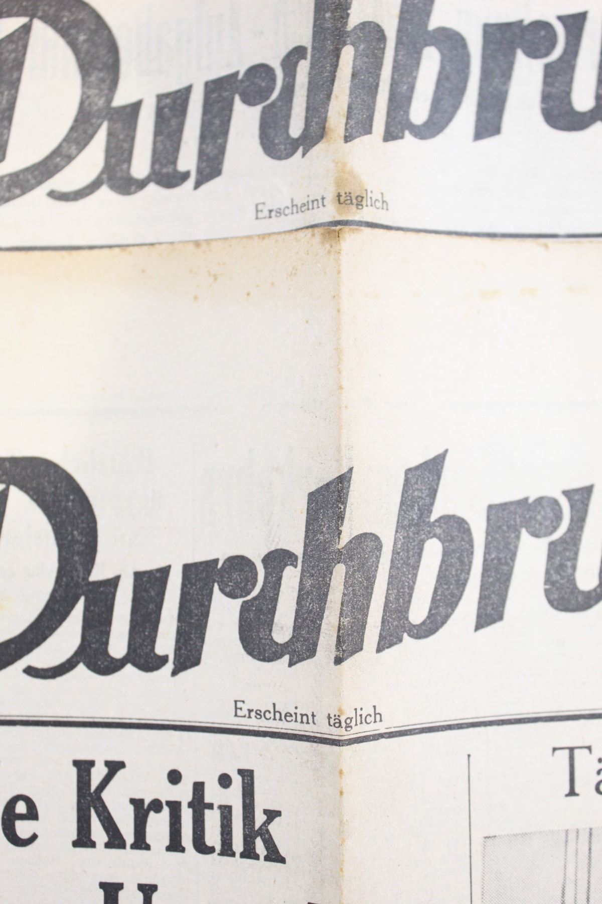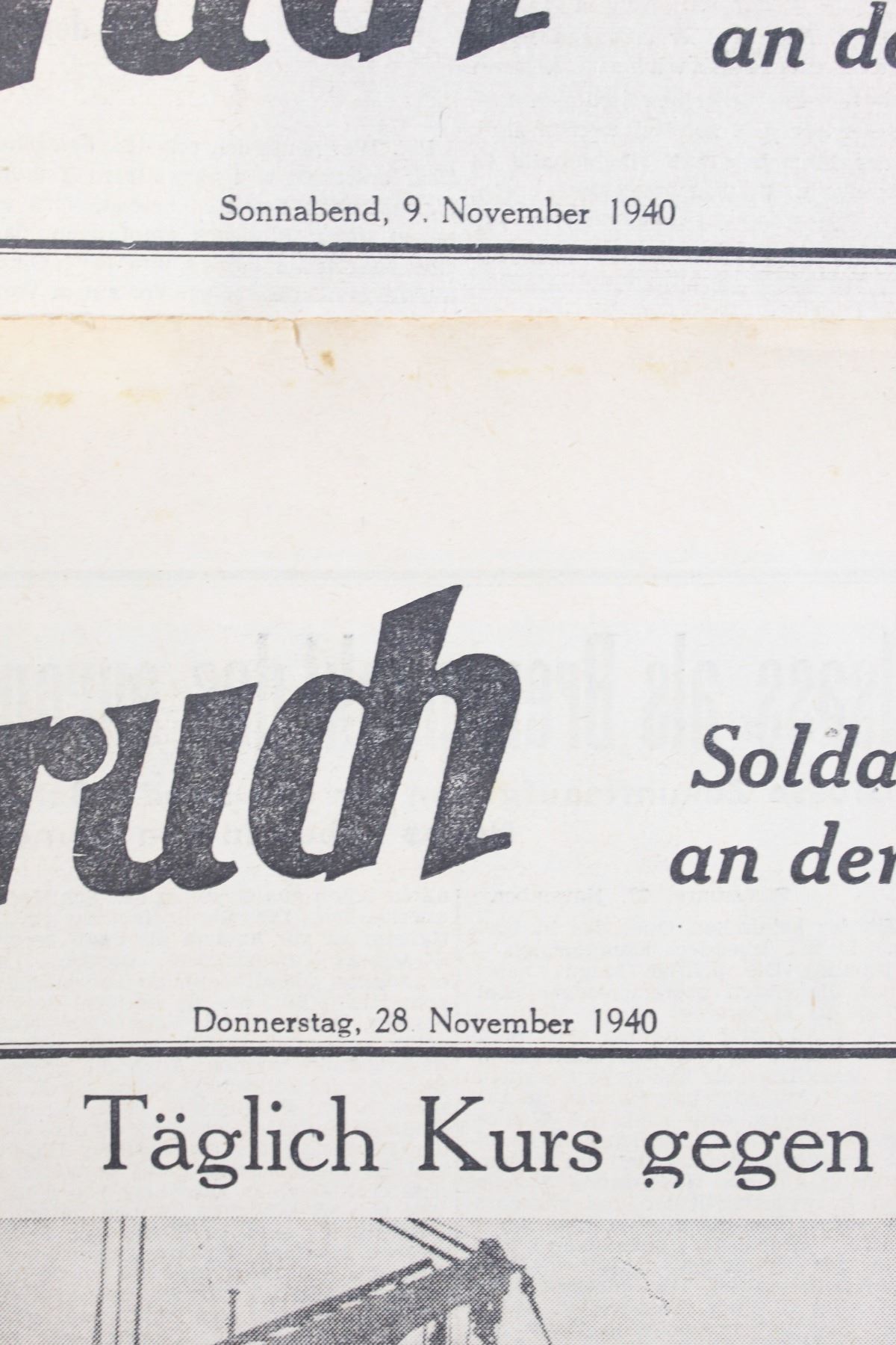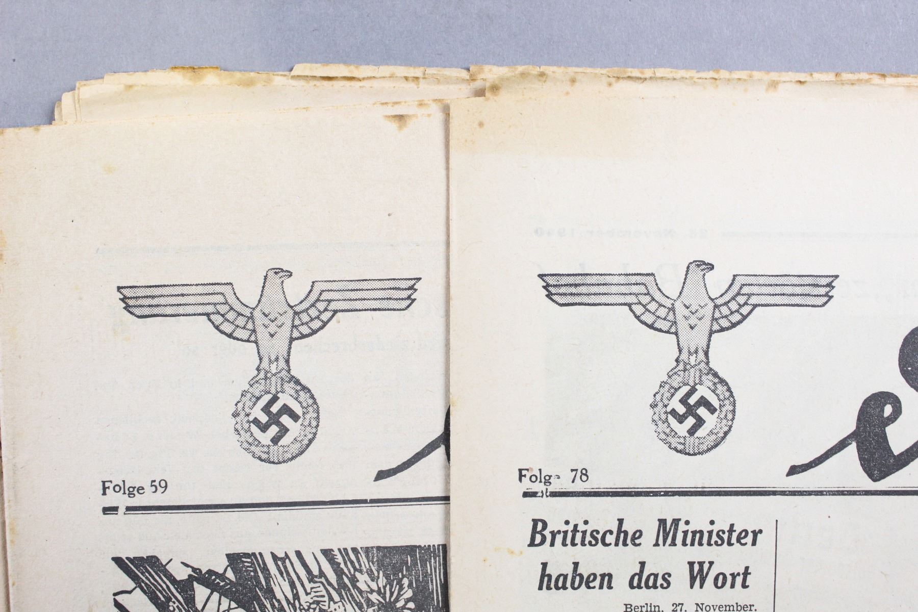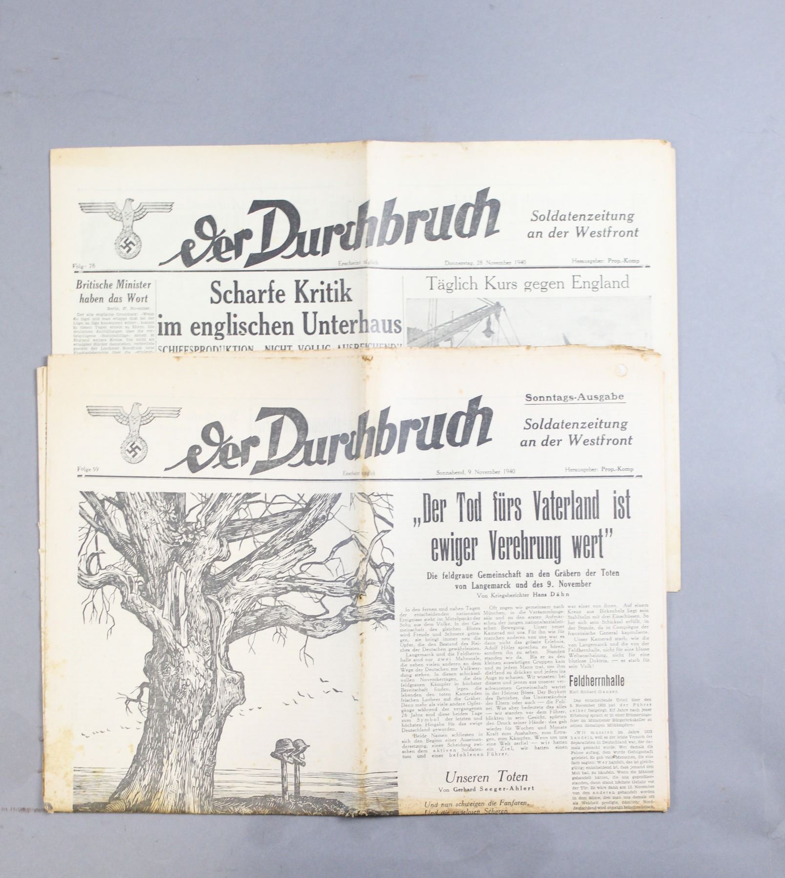 Lot of two German news papers called "Der Durchbruch" translated to "The Break through" dated 9/11/40 and 28/11/1940. Papers are faded yellow from age and have some small tares near the edges. Overall fair condition.