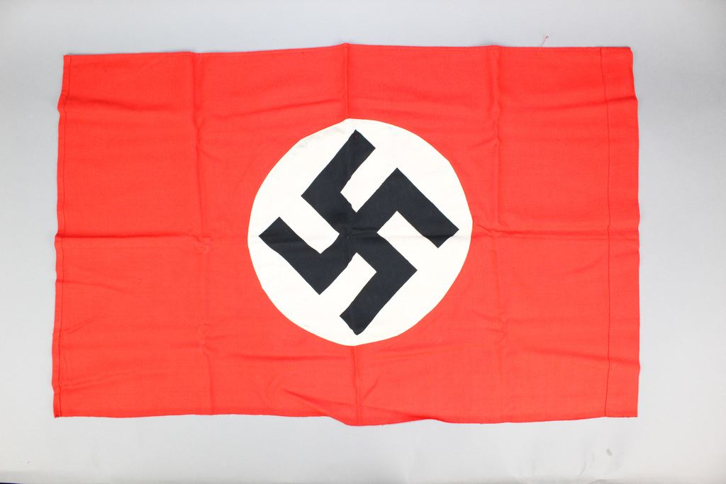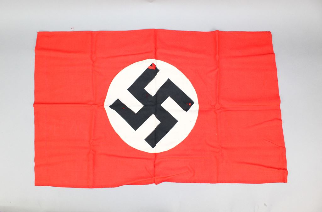 Small WWII Nazi Flag. The black swastika in a white circle with a red background had been the flag of the Nazi party since 1920 and became the official flag of Germany in 1933 along with the Imperial German flag. In 1935, the Imperial German flag would be done away with and the swastika flag would be the sole national flag of Germany. This small flag has the iconic black swastika in a white circle with a red background. The swastika on one side has some small holes on the legs of the swastika. On that same side, the white circle has some minor staining. The flag is slightly dirty but has no other damage or loose stitching. Fair condition. 28“ x 17.5“