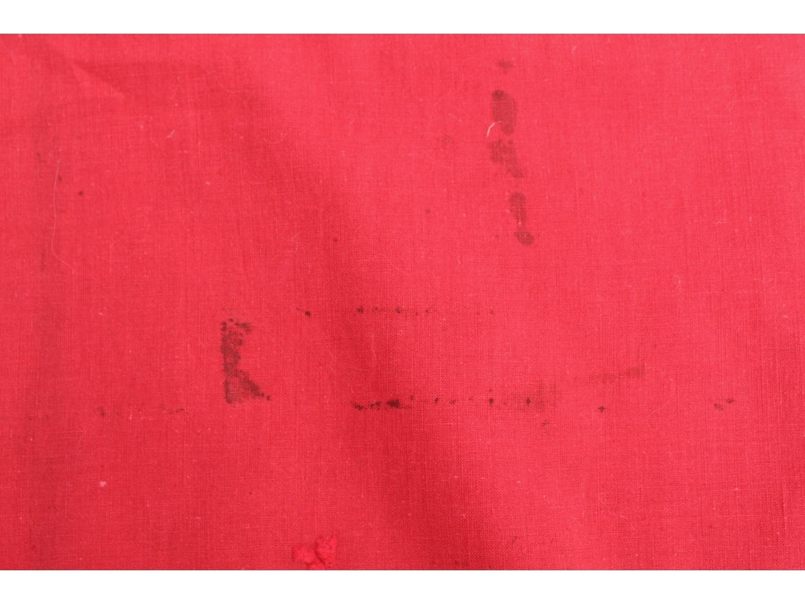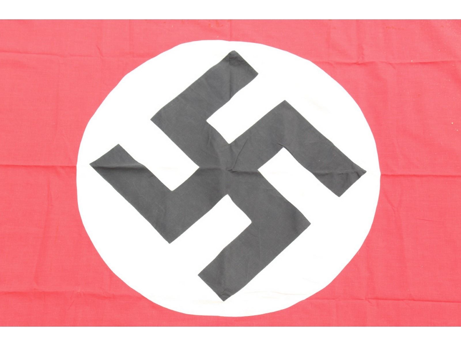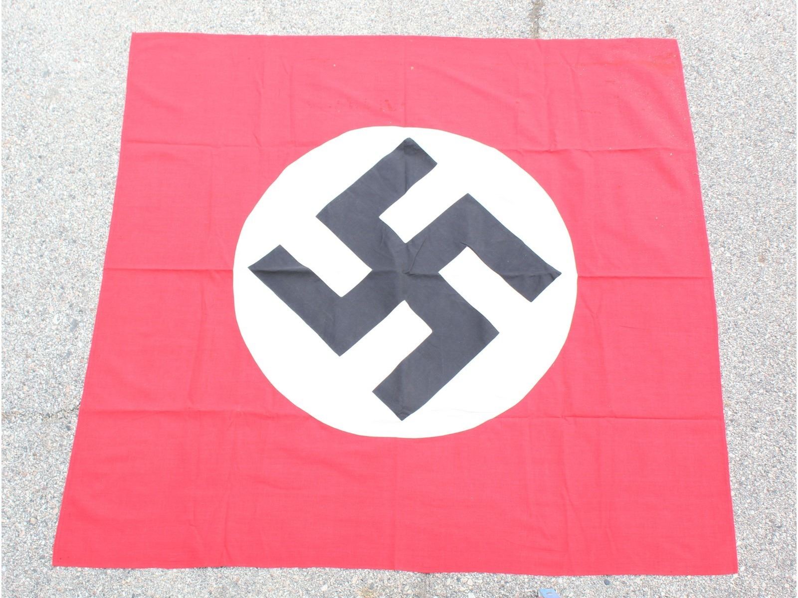 Single sided Nazi flag with red background, white sown circle with black printed swastika. Some minor stains, no rips or tears. Measures 48" x 48".