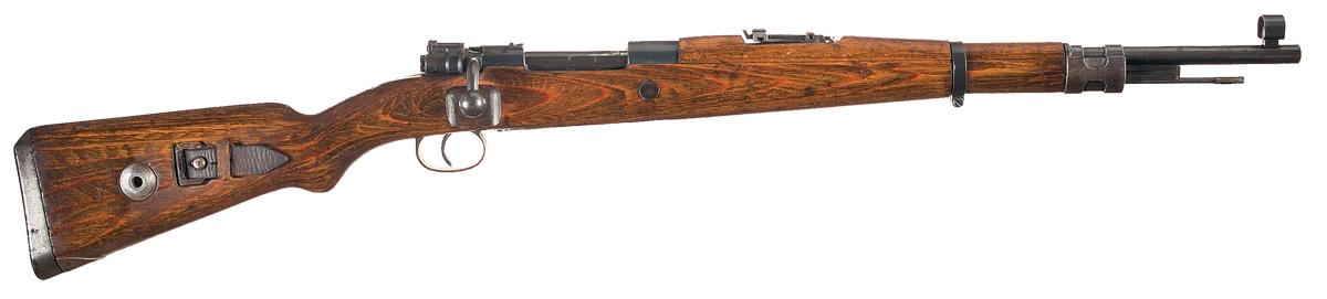 These carbines were the German version of the Czech VZ33 carbine and were manufactured on the small ring, light weight 98K Mauser action with a smaller, lighter weight barrel and stock. The top of the receiver is marked with a single "eagle/63" proof over "dot", the wartime code for the BRNO factory, over "1942", and the left side of the receiver has the serial number and single Eagle firing proof, the side wall is marked "G33/40". The top of the bolt handle is marked with an eagle firing proof and the underside is marked "N9". Hooded inverted 'v" front sight and adjustable rear tangent sight graduated to 1000 meters. The left side of the buttstock has the signature metal plate in front of the buttplate to protect it from damage while in use. Correct full one piece pistol grip stock and full hand guard. The stock is absent of any markings. Complete with an original unmarked leather sling and cleaning rod.
