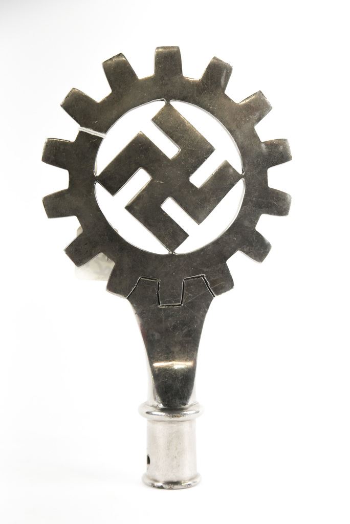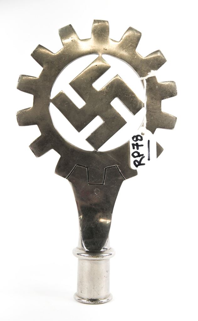 WWII Nazi German Labor Front Flagpole Topper. The Deutsche Arbeitsfront (German Labour Front or DAF) was the Nazi organization that would replace all trade unions in Germany and become the only union in Nazi Germany. The DAF was responsible for the welfare of all workers in Nazi Germany. The DAF would go on to create many benefits for the German people in exchange for their absolute loyalty. This flagpole topper would go atop a flagpole flying the DAF flag. This topper has a silver like finish that has some wear on the edges of the cog wheel. The base of the topper has the RZM with the mark M3/40 beneath it. The base has some roughness on the inside of the topper. Good condition.