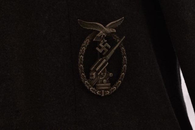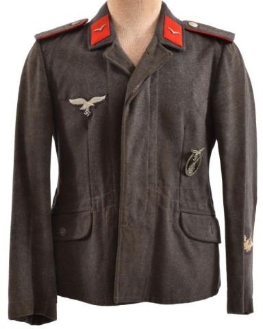 Nazi Luftwaffe Flak Artillery Original Tunic for a Private, c. 1943. Blue-gray wool body, collar, & shoulder straps. Red collar tabs with single gull on each tab. Red piping around shoulder straps. Reproduction Luftwaffe Flak Badge on left breast, whitish-gray embroidered Luftwafffe eagle on right. Lower sleeve has an 88 Flak Artillery Badge embroidered with wings & wreath. Owner's initials "RP" on inside tag lining.