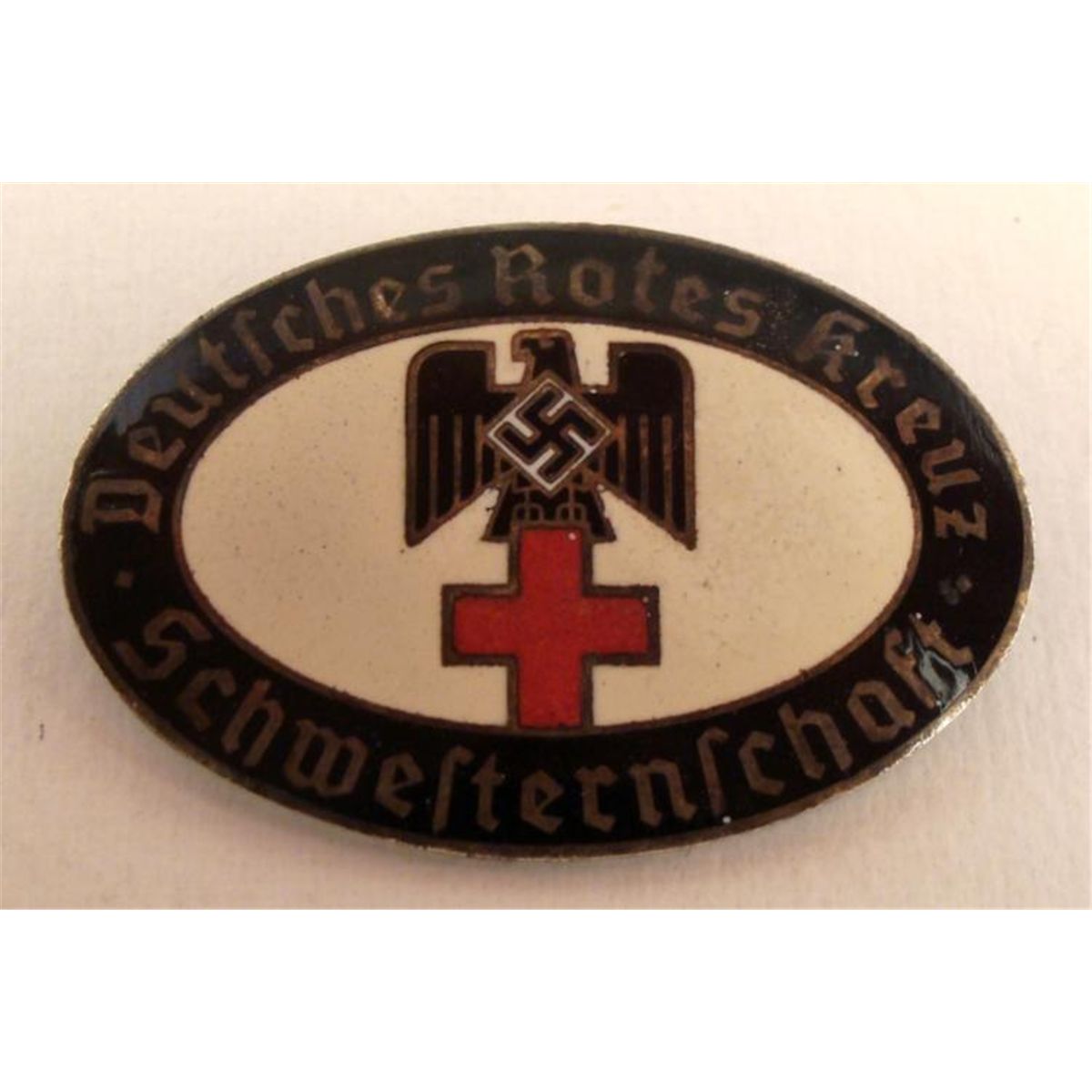 This is an original badge produced for the Nazi era German Red Cross. This one is oval in shape, and it is marked: "Deutsches Rotes Kreuz Schwesternschaft ." It features an eagle, swastika, and red cross emblem. The front is enamel in red, white, and cream color on dark brass tone metal. The reverse is maker marked: "C.T.D. 1692." Its size is approximately 1 1/8" x 1 5/8". The pin on back is missing. However, it is still in excellent condition, and will display well. * This is a fine piece of WWII memorabilia.
