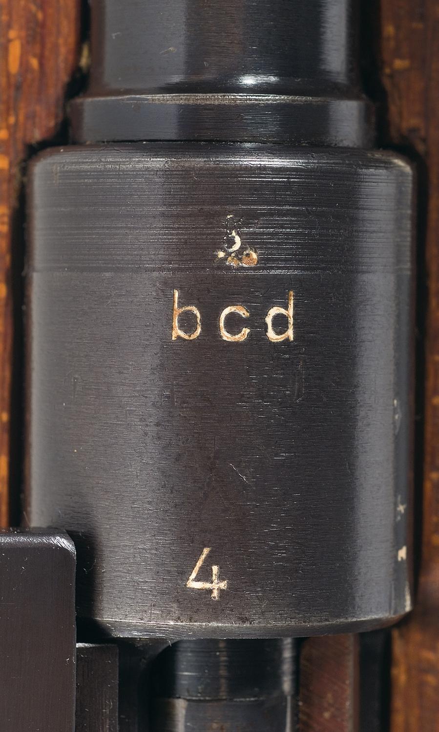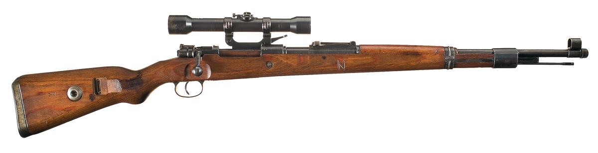 This is an example of a late war production K98 rifle as manufactured by the Gustloff factory. The rifle was subsequently fitted with a Carl Zeiss scope mounted on a short rail system on the left side of the receiver, numbered to the gun The top of the receiver is marked with the "eagle/749" over "bcd" the wartime code for the Gustloff Werke at Weimar and "4" for the year of manufacture. The right side is marked with the number "1" and two Nazi proof marks. The left rear portion of the barrel is marked with the Nazi firing proof, the serial number and an "eagle/748" proof mark. The rifle has a stamped middle barrel band and milled front band, floor plate and trigger guard. Hooded front sight and tangent rear sight graduated to 200 meters. The stock and handguard are the correct "bcd" produced laminated wartime versions and the stock has the correct single "C" proof and Waffenamt on the lower stock area. All visible numbers match.