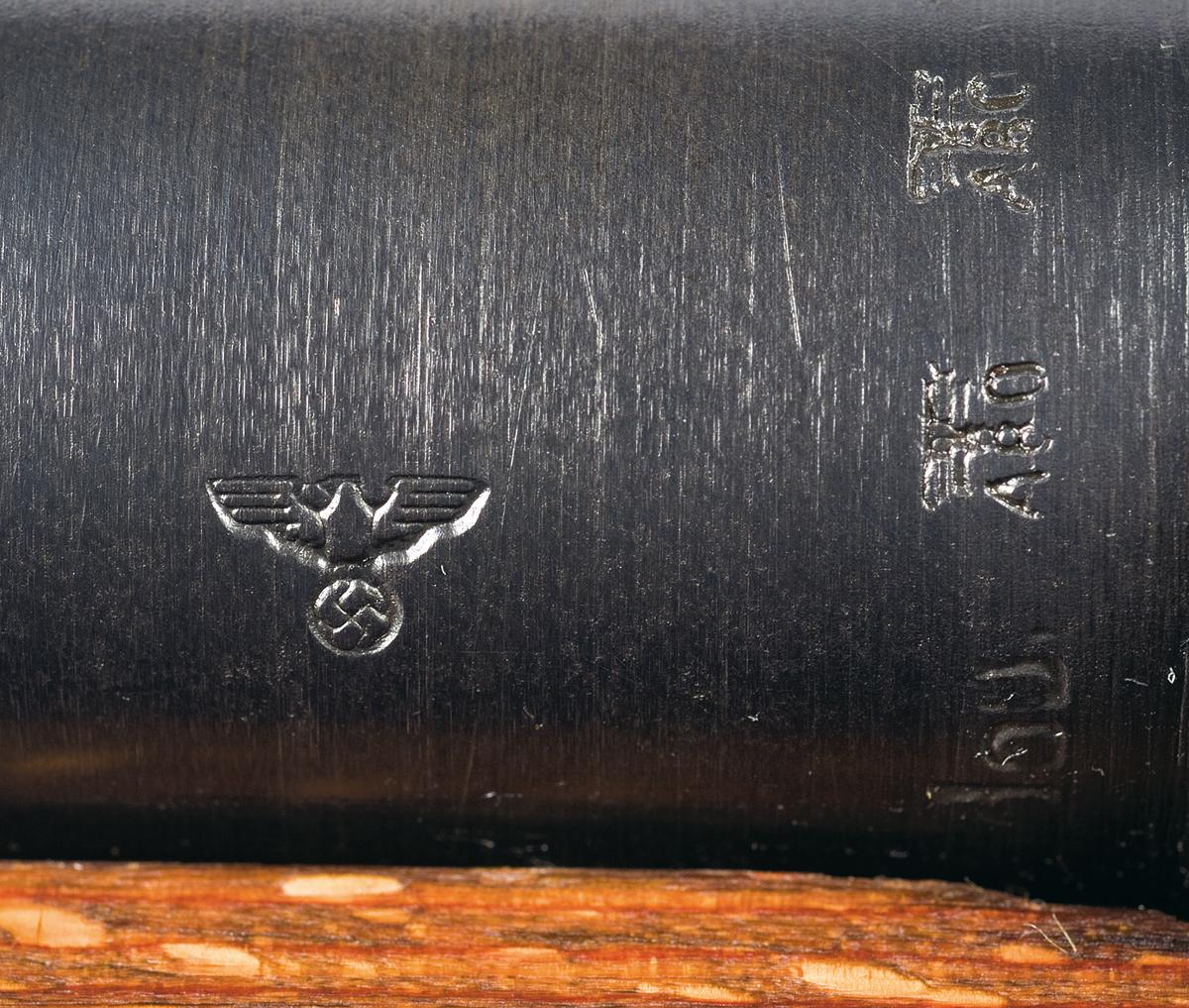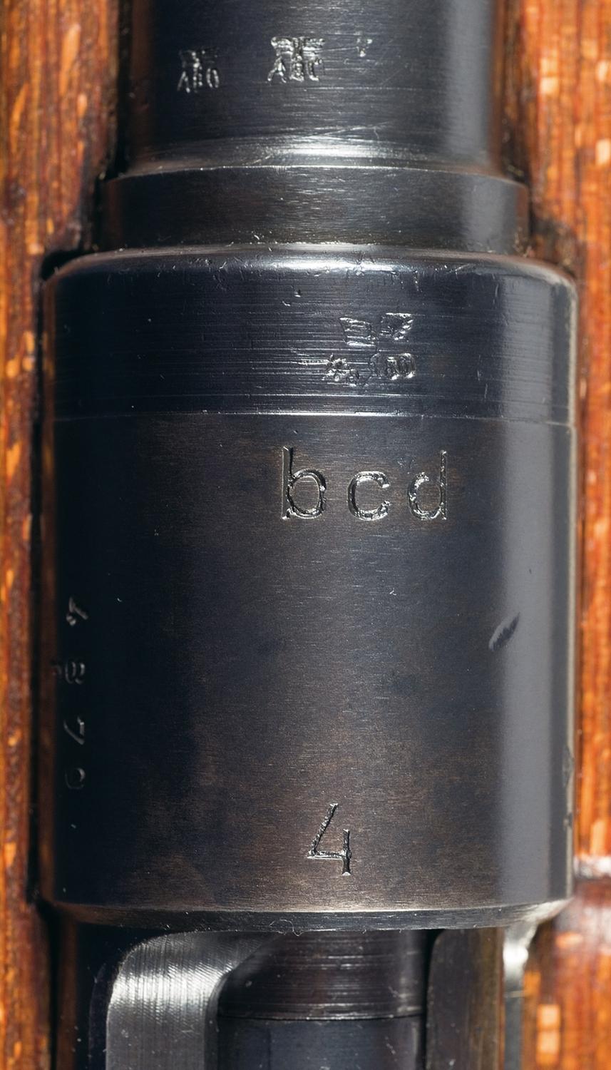 This is an example of a late war production K98 rifle as manufactured by the Gustloff factory. The top of the receiver is marked with the "eagle/WaA80" over "bcd" the wartime code for the Gustloff Werke at Weimar and "4" for the year of manufacture, the left side is marked with the serial number and the right side with a Nazi firing proof and the number "1". The left side receiver wall is marked "Mod 98". The left rear portion of the barrel is marked with the firing proof and "dou" with two "eagle/A80" proofs at the breech. The rifle has the mid-war pattern all milled components to include the closed and milled upper barrel band. Hooded front sight and tangent rear sight graduated to 200 meters, The stock and handguard are the correct "bcd" produced laminated wartime versions and the stock has the correct single "C" proof on the lower stock area and a Waffenamt over "H" on the right side. All visible numbers match. Complete with a bayonet with serrated Bakelite handle with a metal scabbard and leather frog.