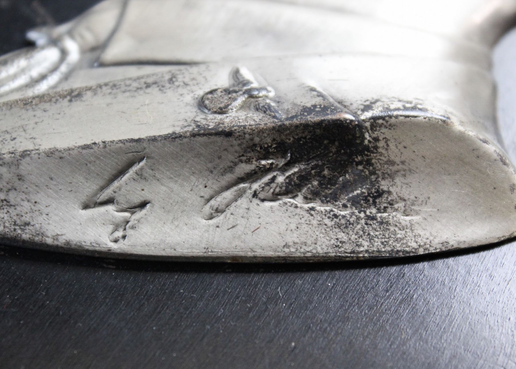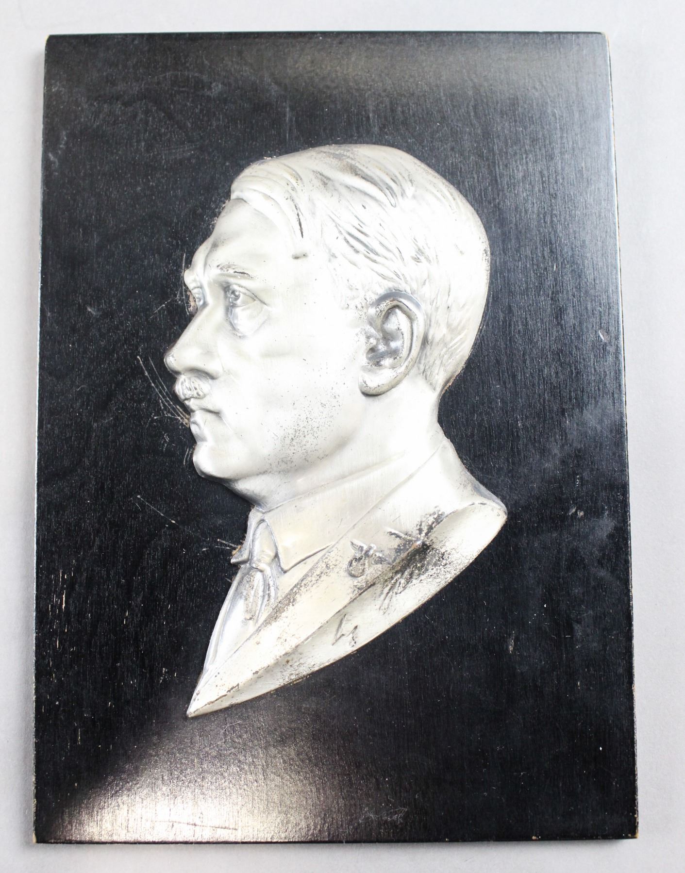Plaque of Hitler made from metal on a black wooden background. Hitler has an early nazi party eagle on his lapel. Hitler's signature was engraved on the lower part of his body during production. Silver coloring is wearing off. Measures 6 1/4" x 8 3/4". Overall good condition.