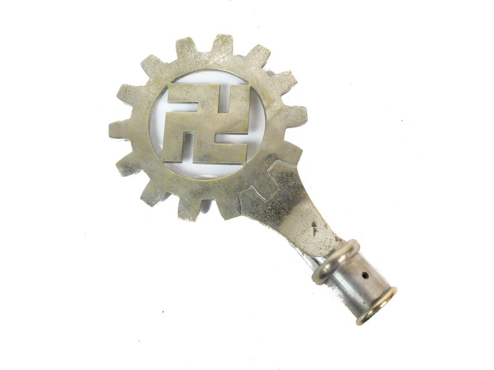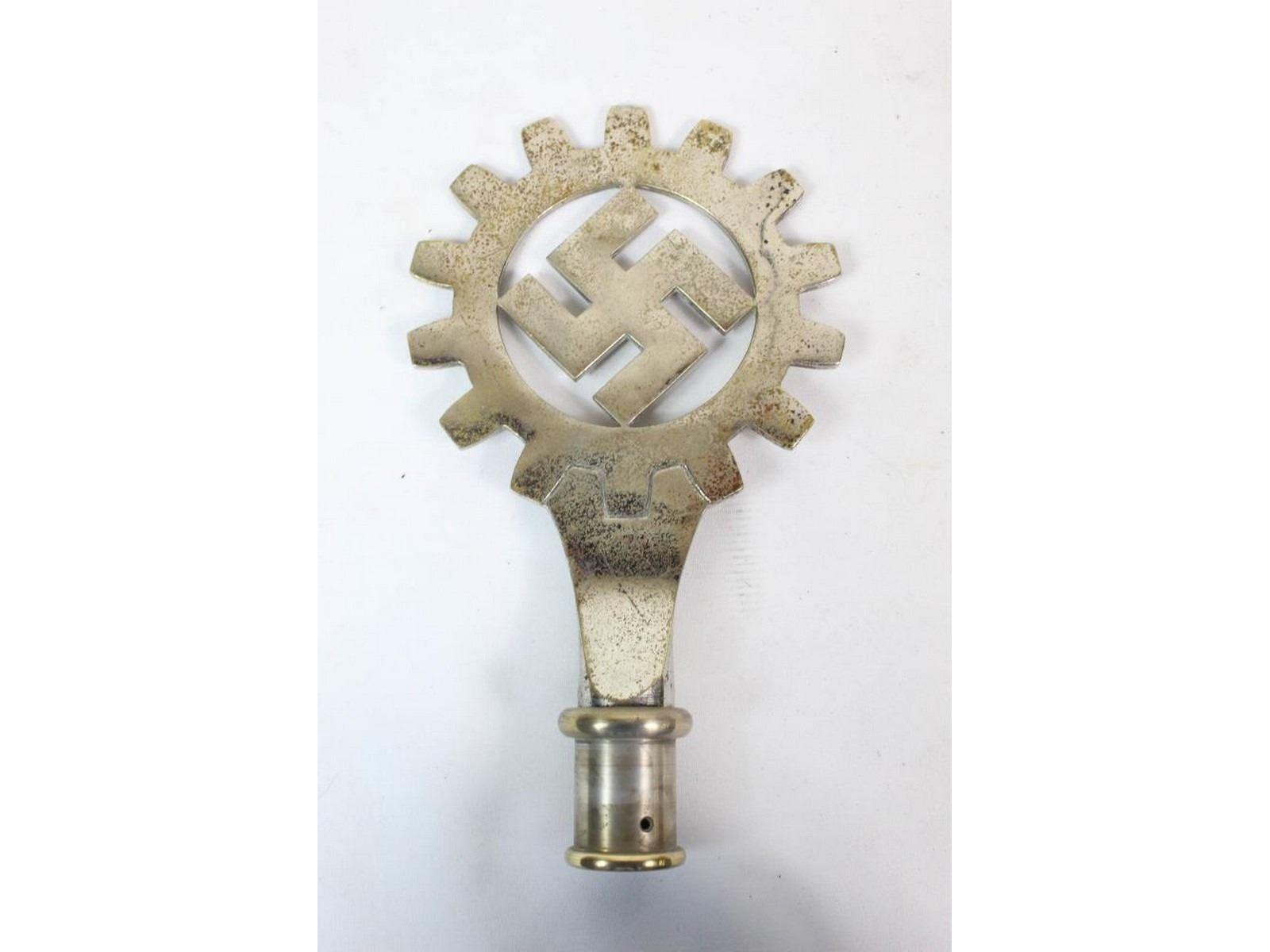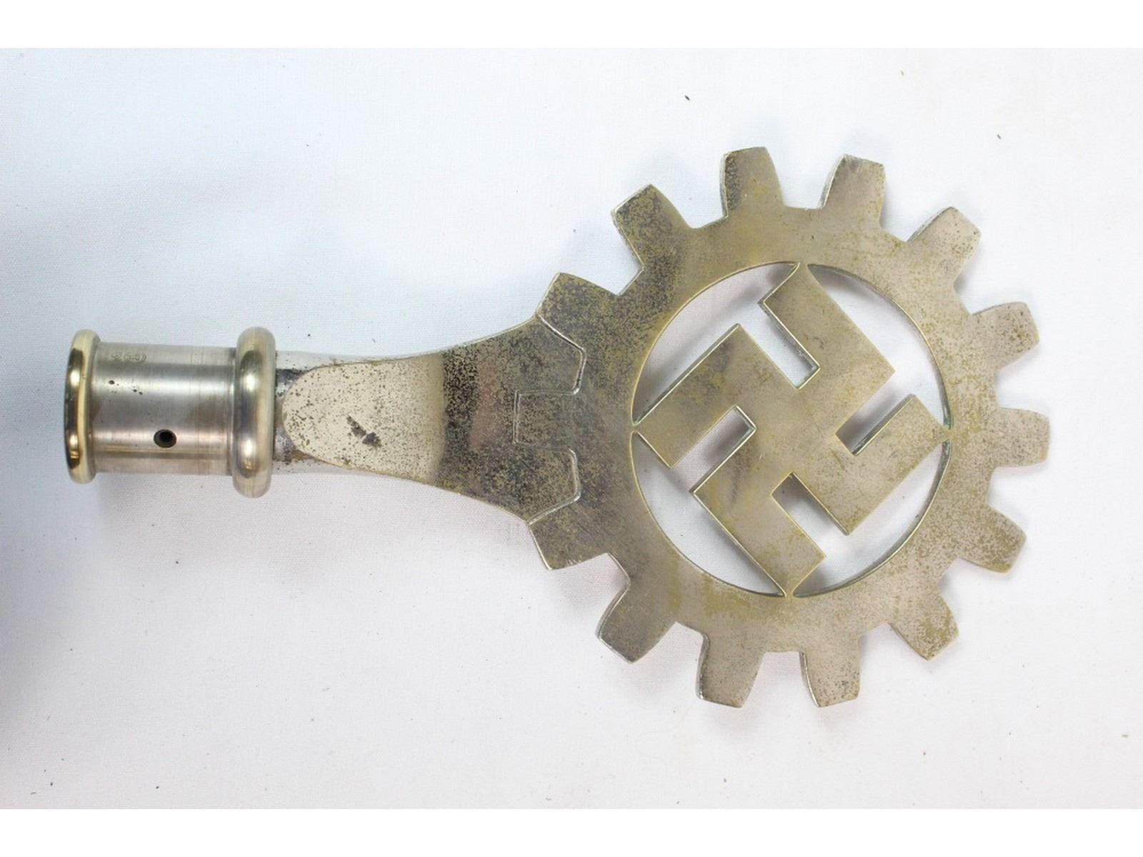 WWII Nazi Labor Corps Flagpole Topper. The Deutsche Arbeitsfront (German Labour Front or DAF) was the Nazi organization that would replace all trade unions in Germany and become the only union in Nazi Germany. The DAF was responsible for the welfare of all workers in Nazi Germany. The DAF would go on to create many benefits for the German people in exchange for their absolute loyalty. This flagpole topper would adorn the flagpoles that bore DAF flags. This topper is made out of brass and has a nickel finish. Nickel finish wearing off exposing brass in small patches. No damage to topper. Good condition. Measures 10" x 6".