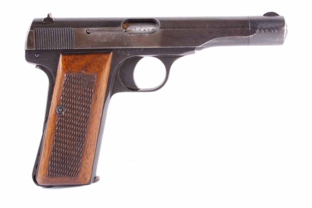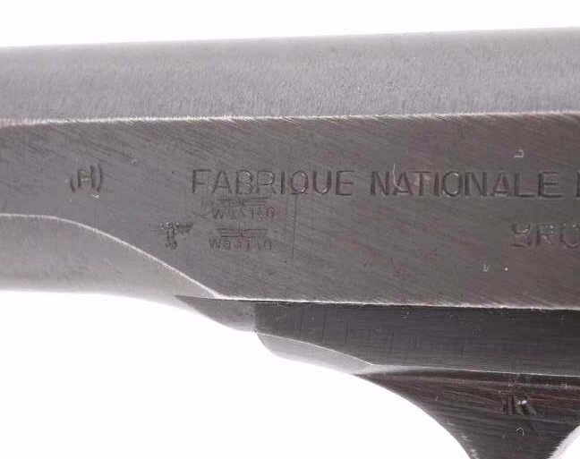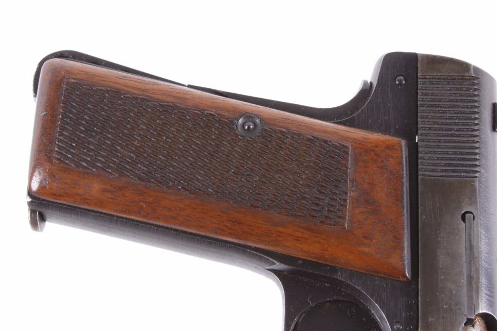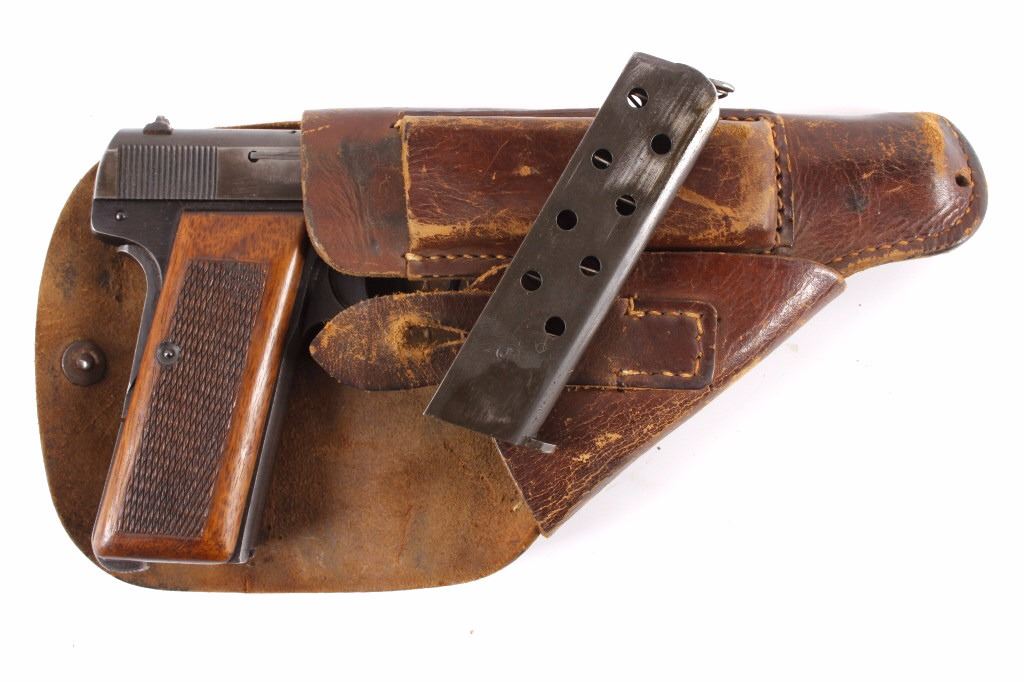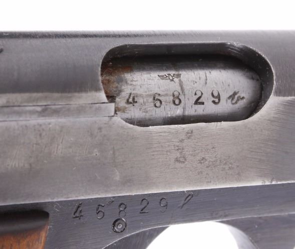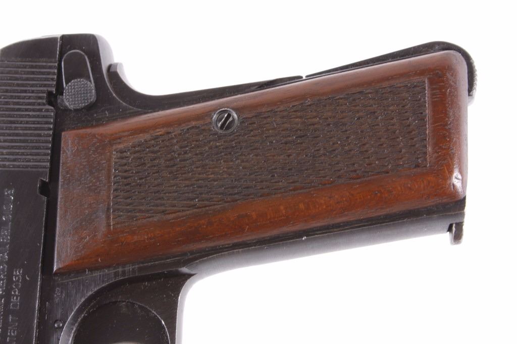 This is an exceptionally rare Belgian Browning Fabrique Nationale Model 1922 pistol and was a WWII Nazi German issue pistol in 7.65mm caliber. The pistol was used by both the German Army NCOs and Luftwaffe pilots. The pistol has the original frame and slide stamp with “eagle/WaA140” Nazi German acceptance marks and “eagle/swastika” firing proofs. The handgun is fitted with fixed sights and the walnut wood checkered grips and shows much if not all of the original blue finish with holster wear (fine condition). Included with the pistol is the original brown leather Luftwaffe Nazi German flap holster, unmarked. This is an excellent European Theater capture pistol. Firearm marked, "FABRIQUE NATIONALE D'ARMES DE GUERRE HERSTAL BELGIQUE BROWNING'S PATENT DEPOSE - 46829 (all matching)." Serial Number 46829B. Curio & Relic FFL Transfer or NICS Background required.
