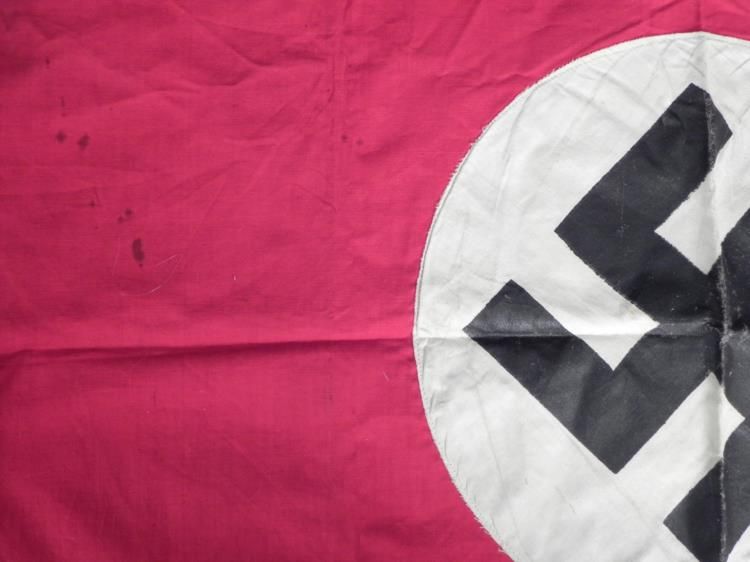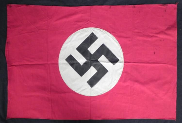 This is a WWII era Nazi NSDAP double sided banner. It has a white disc with swastika sewn on either side. The size is 19 x 28 inches. There is some spotting, and wear on the swastika on one side. Overall it displays well. * This is a fine small banner.