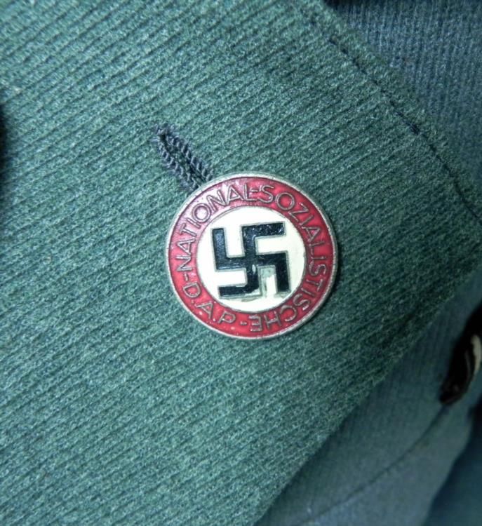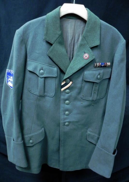 Here is a WWII Nazi Naval Jacket with Navel Patches, Medals, a Swastika Lapel Pin, and a Regiment Band. This jacket is in excellent condition, no holes, rips, or tears, and shows very little wear. All original buttons are present.