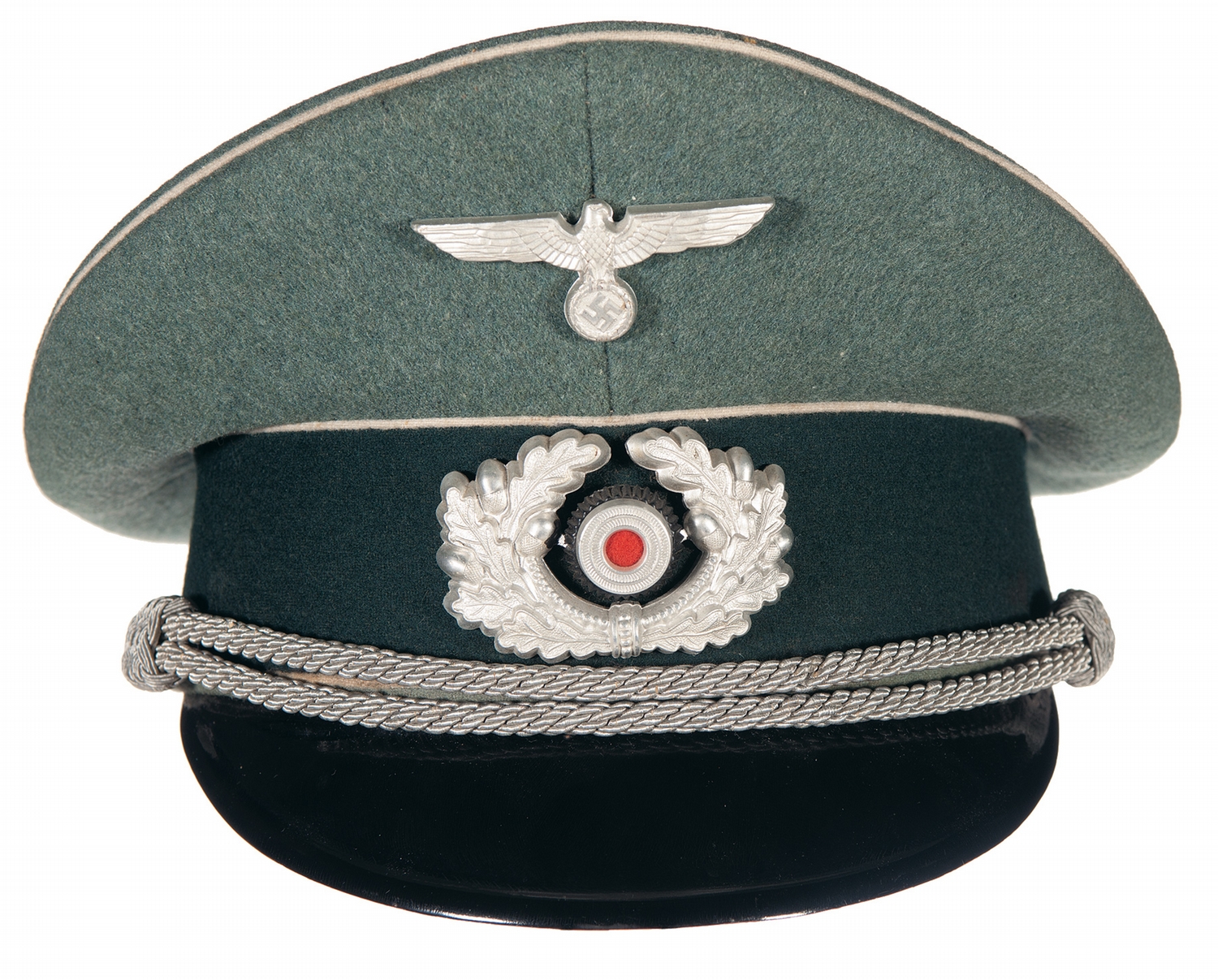 Very nice Nazi peaked visor cap, field green/gray felt construction with a darker green headband and white piping. Stamped alloy eagle and wreathed cockade, with a silver cord chinstrap and black leather visor. Green leather sweatband and silk lining, with "Peter Kren/ Bonn/ Stirndruckfrei/ Deutsches Reichspatent" on the plastic diamond and "Uffz. Eickhoff Stab III/77" on a paper tag. Unteroffizer Eickhorn and his unit have not been identified.