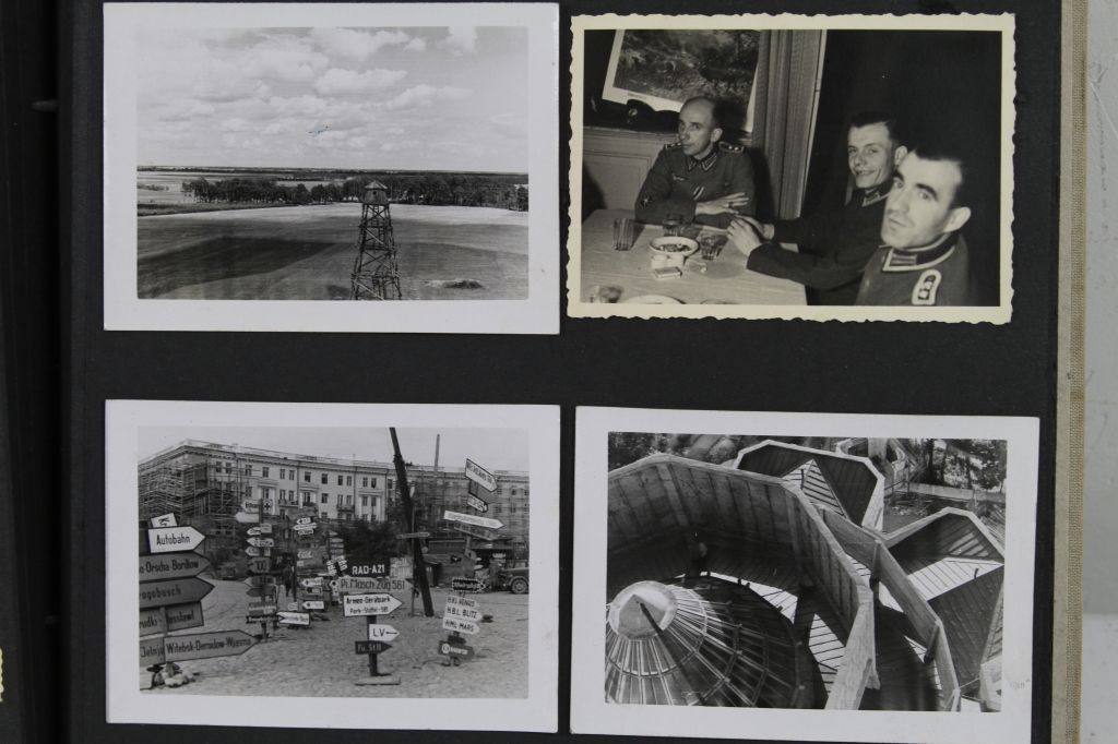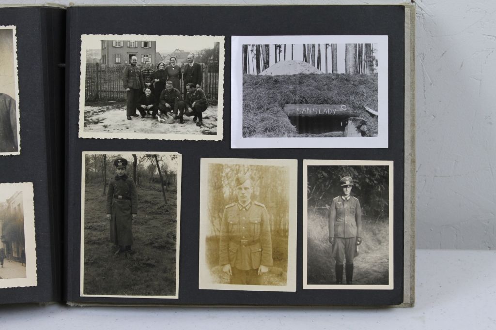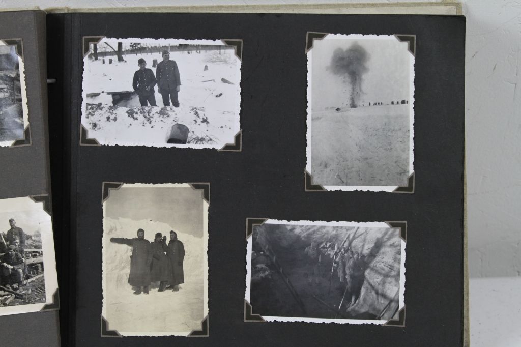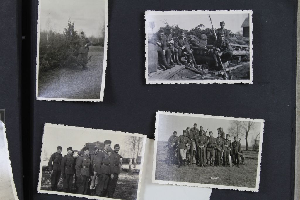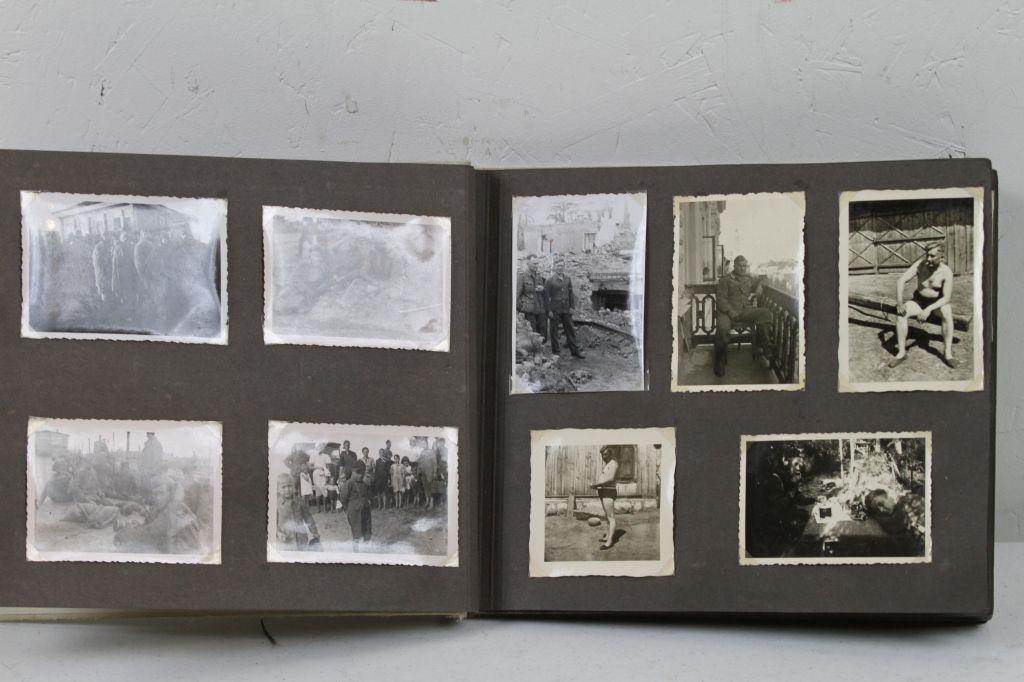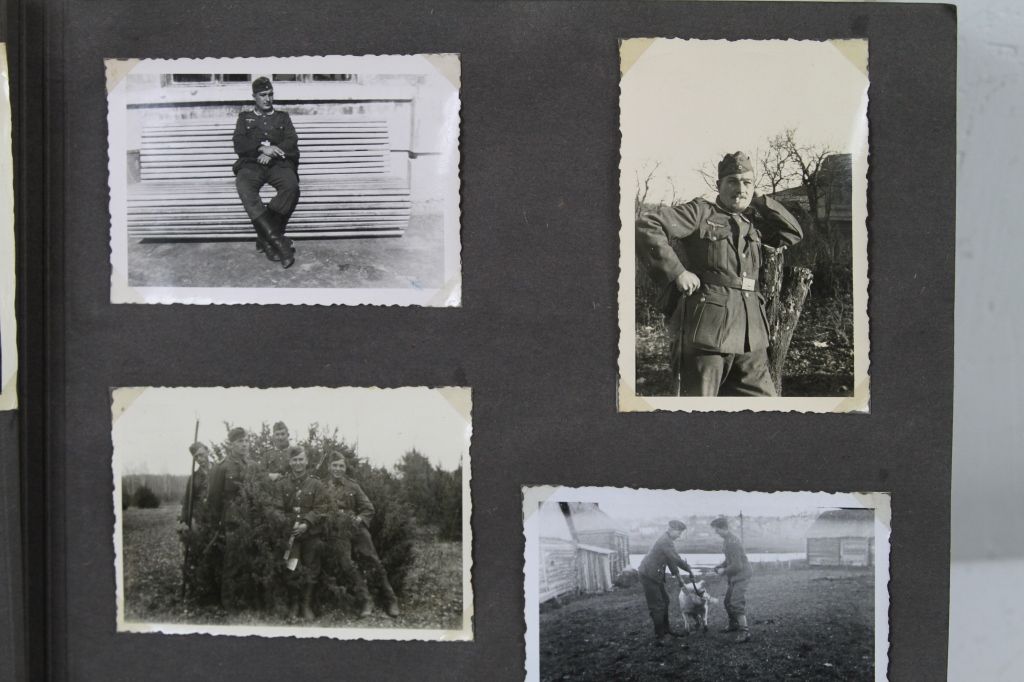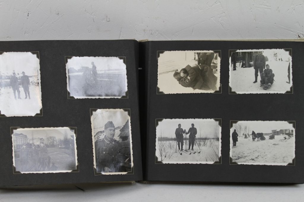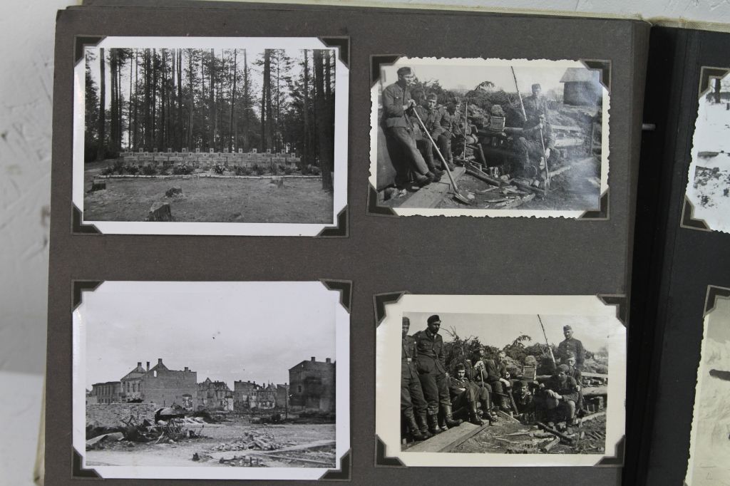 WWII Nazi Photo Album This Photo Album follows one German Nazi Soldier thru the Russian Front of WWII. RARE piece of History. Front of the book reads, "Mein Kriegserinnerungen" (Translated to "My War Memories")with a Nazi Helmet also. Around 100 Photographs with some to most having writing on the back.