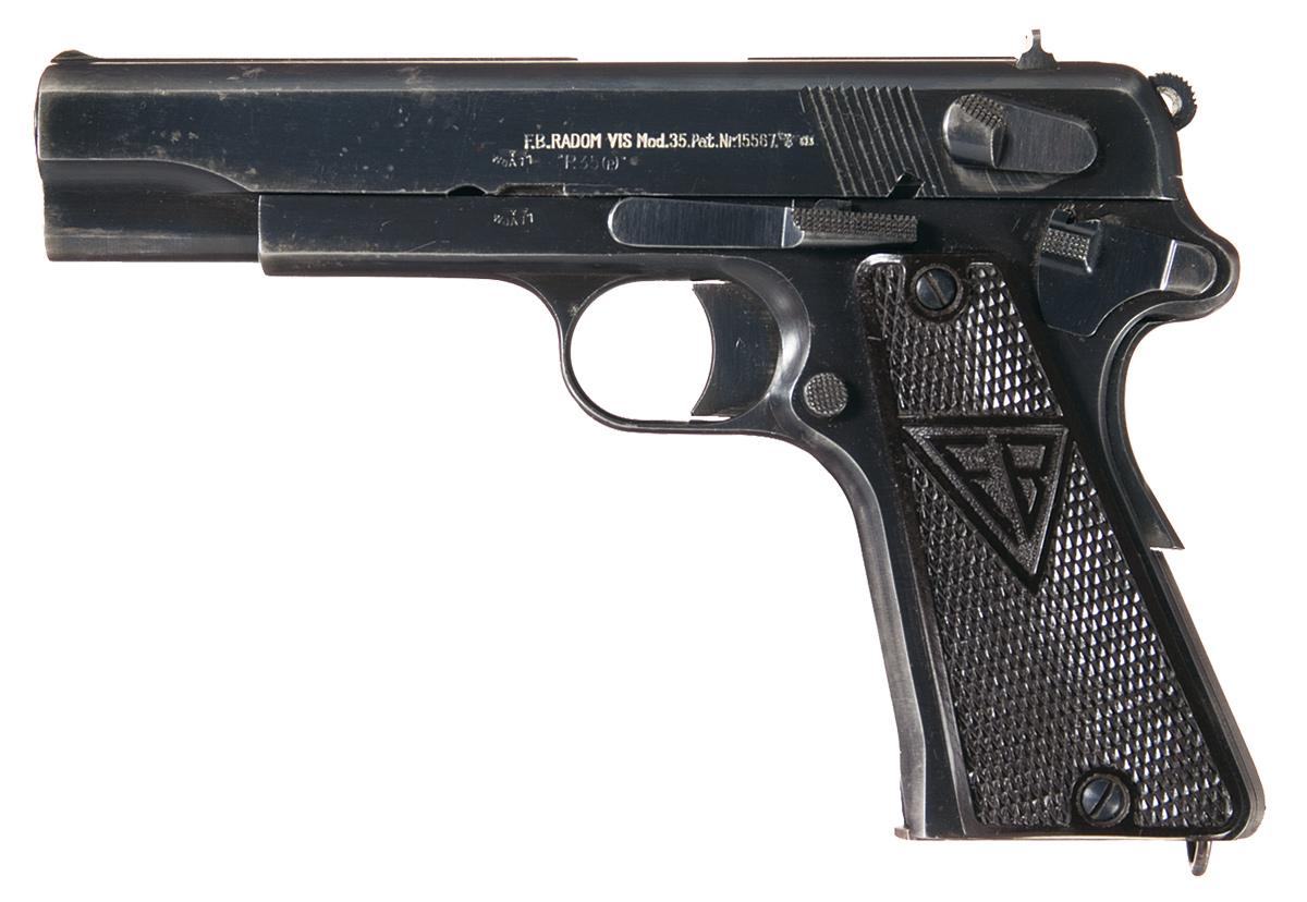 This pistol has a blue finish, shoulder stock slot (no stock) and black checkered plastic grips marked "VIS" on the right side and "FB" on the left. The barrel and recoil spring guide are "in the white" and the remainder of the pistol has a high polished blue finish. The left side of the slide is marked "F.B. RADOM VIS MOD. 35. Pat. Nr.15567 / "P35 (p). The serial number is located on the right side of the frame above the trigger. The Nazi army eagle/swastika firing proof and "eagle /625" are stamped on the left side of the slide behind the nomenclature and the eagle/WaA77 German army acceptance stamp is located on the left side of the slide and frame. Markings are highlighted in white.