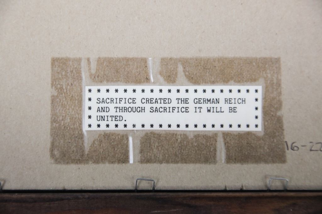 The poster has the Nazi eagle atop swastika above a message that translates to "Sacrifice created the German Reich and through sacrifice, it will be united." Poster is yellow from age and the lettering is clear and legible. See photo.