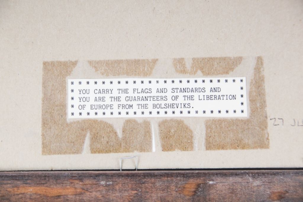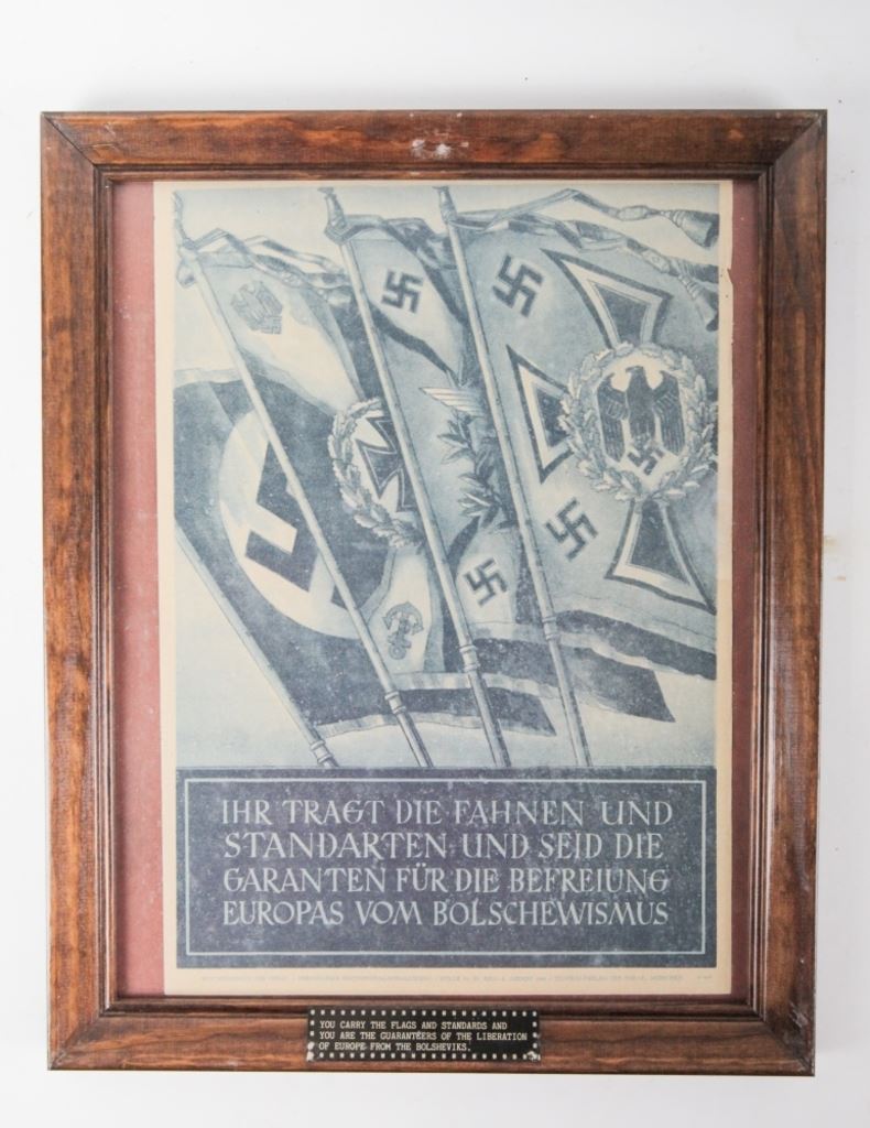A propaganda poster of four Nazi flags with a message below that translates to "You carry the flags and standards and you are the guaranteers of the liberation of Europe from the Bolsheviks.". Poster has wear on the edges and is yellow with age. The lettering is clear and legible.
